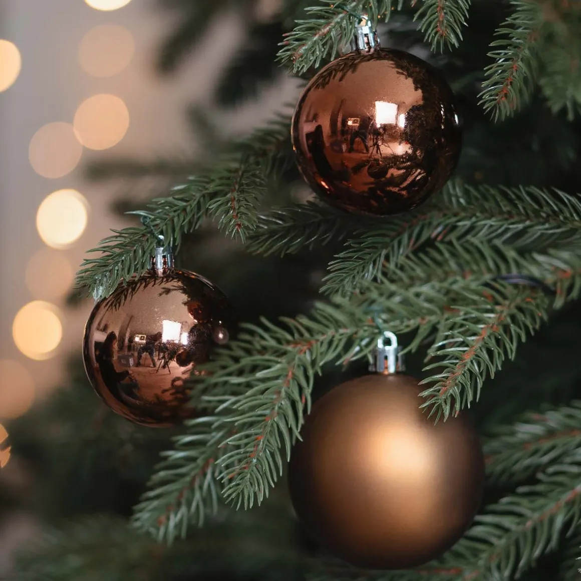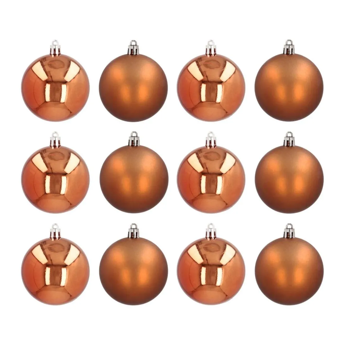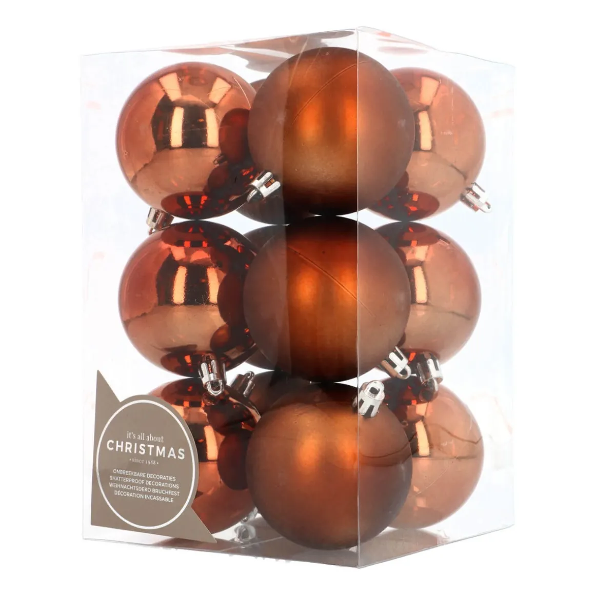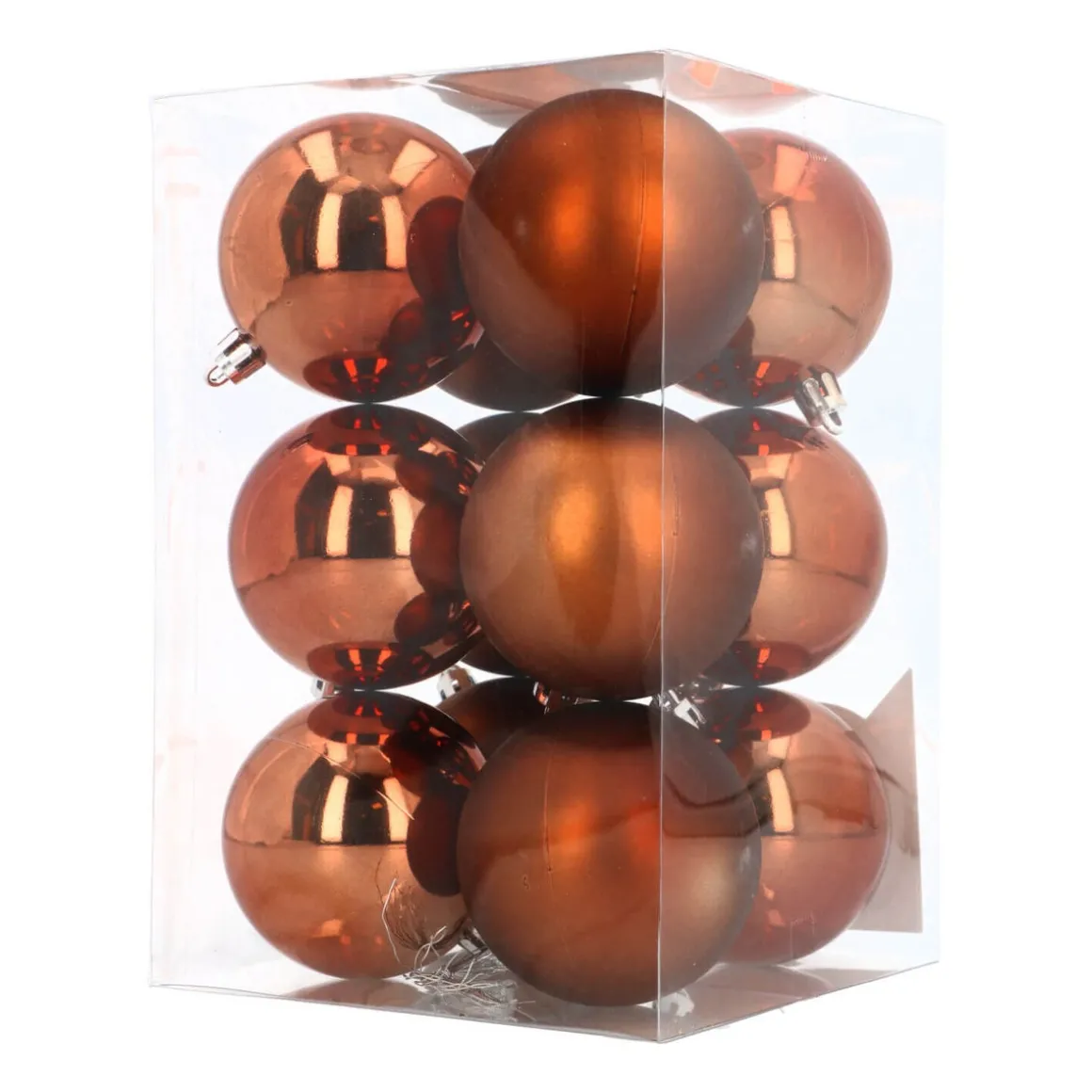 Set aus 12 Weihnachtskugeln in Bronze à 7 cm. Enthalten sind matte, glänzende und glitzernde Kugeln. Die Christbaumkugeln sind aus strapazierfähigem Kunststoff hergestellt und daher nahezu bruchfest sowie langlebig. Verpackt ist der Christbaumschmuck in einer praktischen wie sicheren Kunststoff-Box, die zur späteren Aufbewahrung genutzt werden kann.