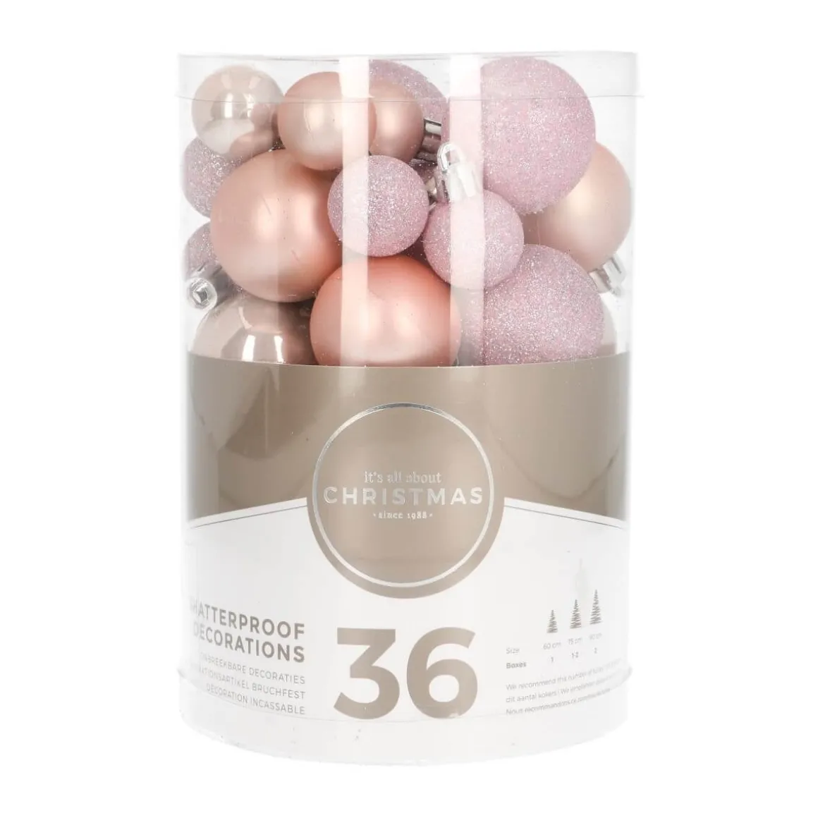 Vollständiges Set aus 36 kleinen Weihnachtskugeln in Rosa. Enthalten sind matte, glänzende und glitzernde Kugeln in verschiedenen Pastellrosatönen. Die Christbaumkugeln sind aus strapazierfähigem Kunststoff hergestellt und daher nahezu bruchfest sowie langlebig. Verpackt ist der Christbaumschmuck in einem praktischen wie sicheren Kunststoff-Zylinder, der zur späteren Aufbewahrung genutzt werden kann.