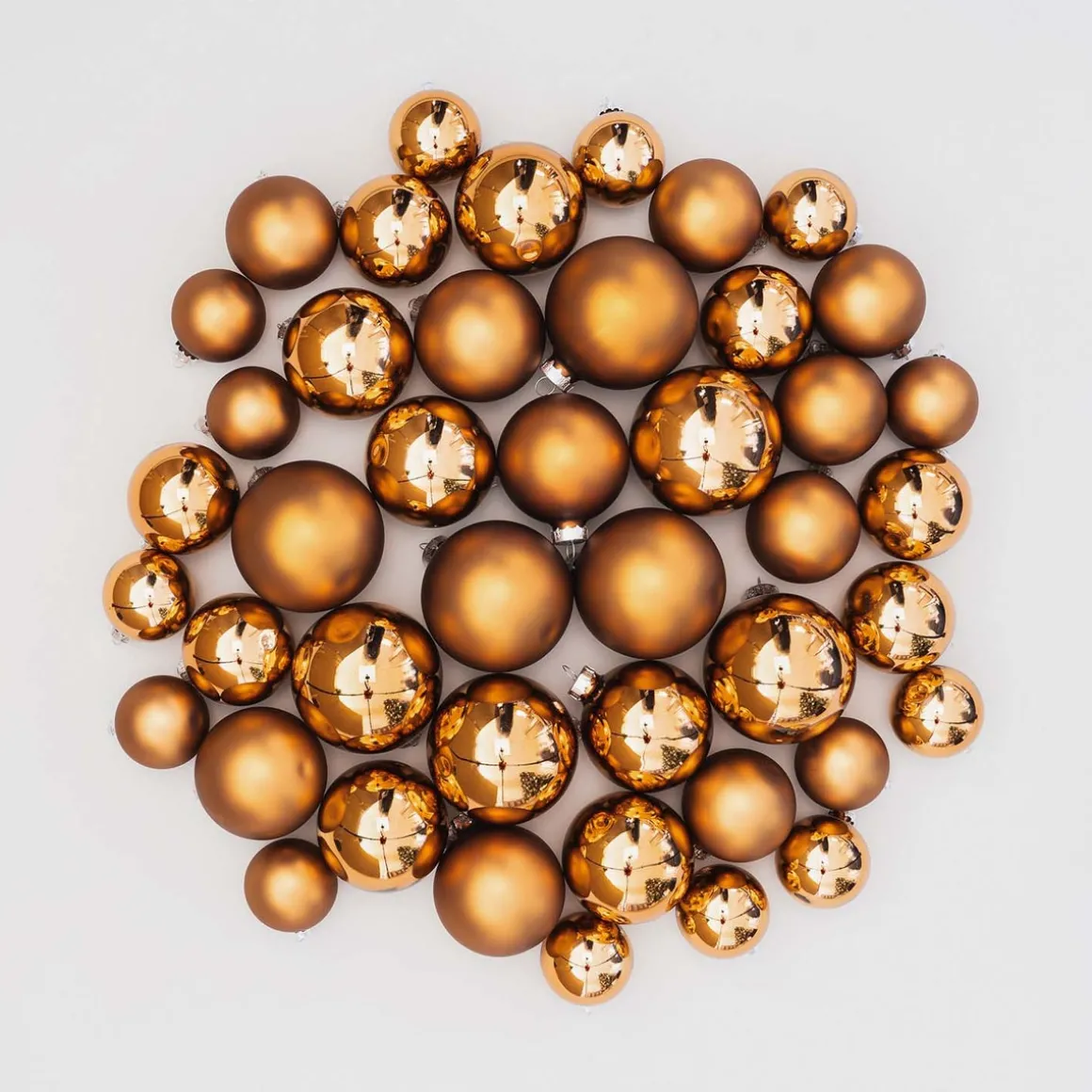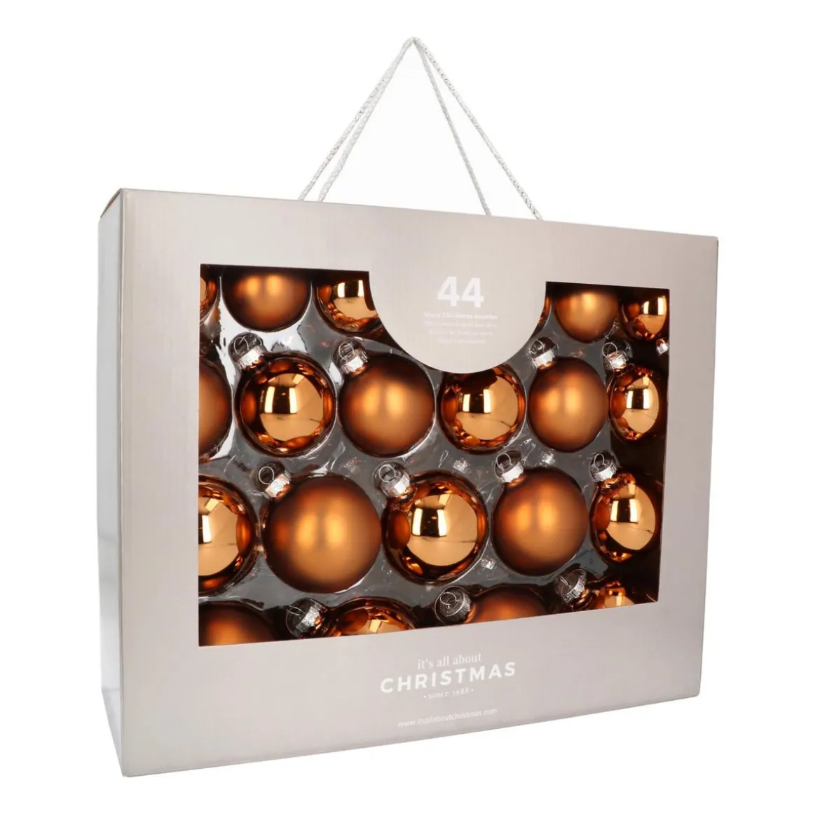 Hochwertiges Set aus 44 Weihnachtskugeln in Bronze, hergestellt aus Glas. Enthalten sind matte und glänzende Kugeln in den Größen 5, 6, 7 und 8 cm. Dieses Weihnachtskugeln-Set befindet sich in einem praktischen Koffer mit Schnurgriff, in dem die Glaskugeln gut geschützt sind und platzsparend aufbewahrt werden können.