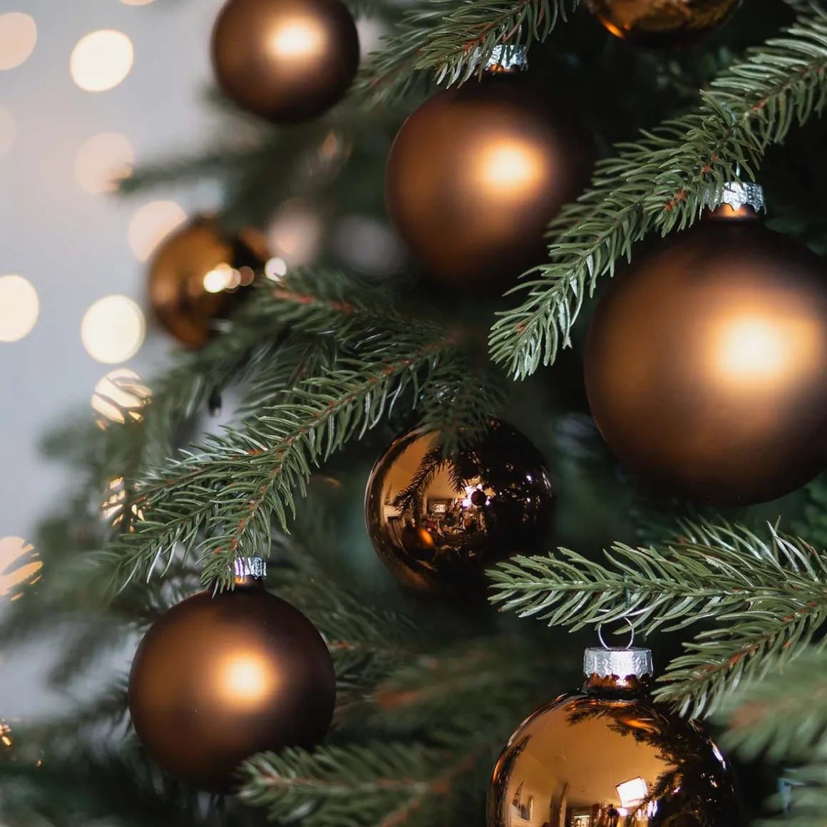 Bronze Weihnachtskugeln stehen für einen industriellen Look. Obwohl Bronze eher zu den traditionellen Weihnachtsfarben gehört und daher gut zu Rot oder Gold passt, findet sich die ins Braune gehende Farbe heute verstärkt in trendigen Designs wieder. Sehr populär ist die Verwendung von Bronze in unserem Forest-Thema, bei dem nebem Bronze noch Grün und Weiß zu einem naturfarbenen Mix zusammenfinden.