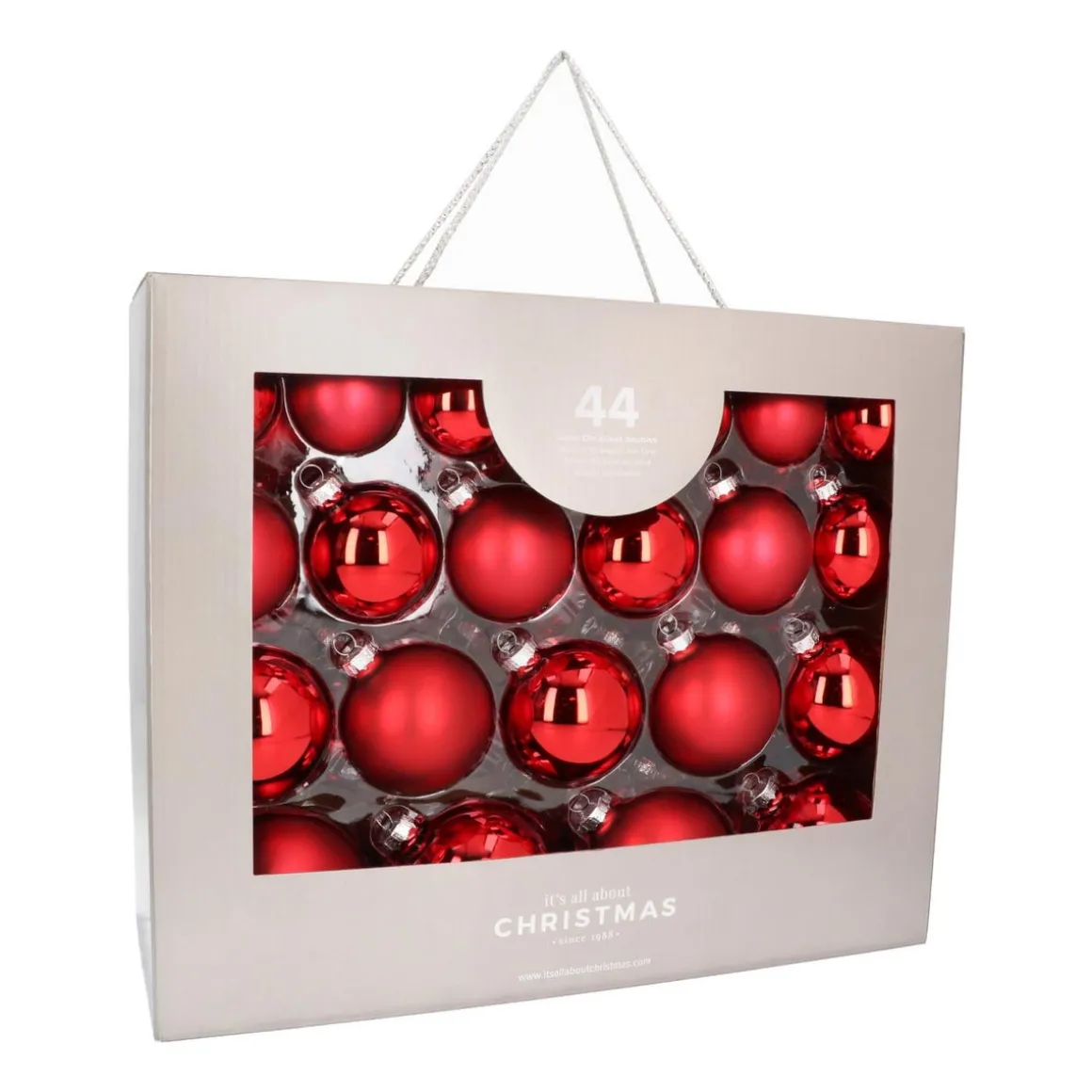 Hochwertiges Set aus 44 Weihnachtskugeln in Rot, hergestellt aus Glas. Enthalten sind matte und glänzende Kugeln in den Größen 5, 6, 7 und 8 cm. Dieses Weihnachtskugeln-Set befindet sich in einem praktischen Koffer mit Schnurgriff, in dem die Glaskugeln gut geschützt sind und platzsparend aufbewahrt werden können.