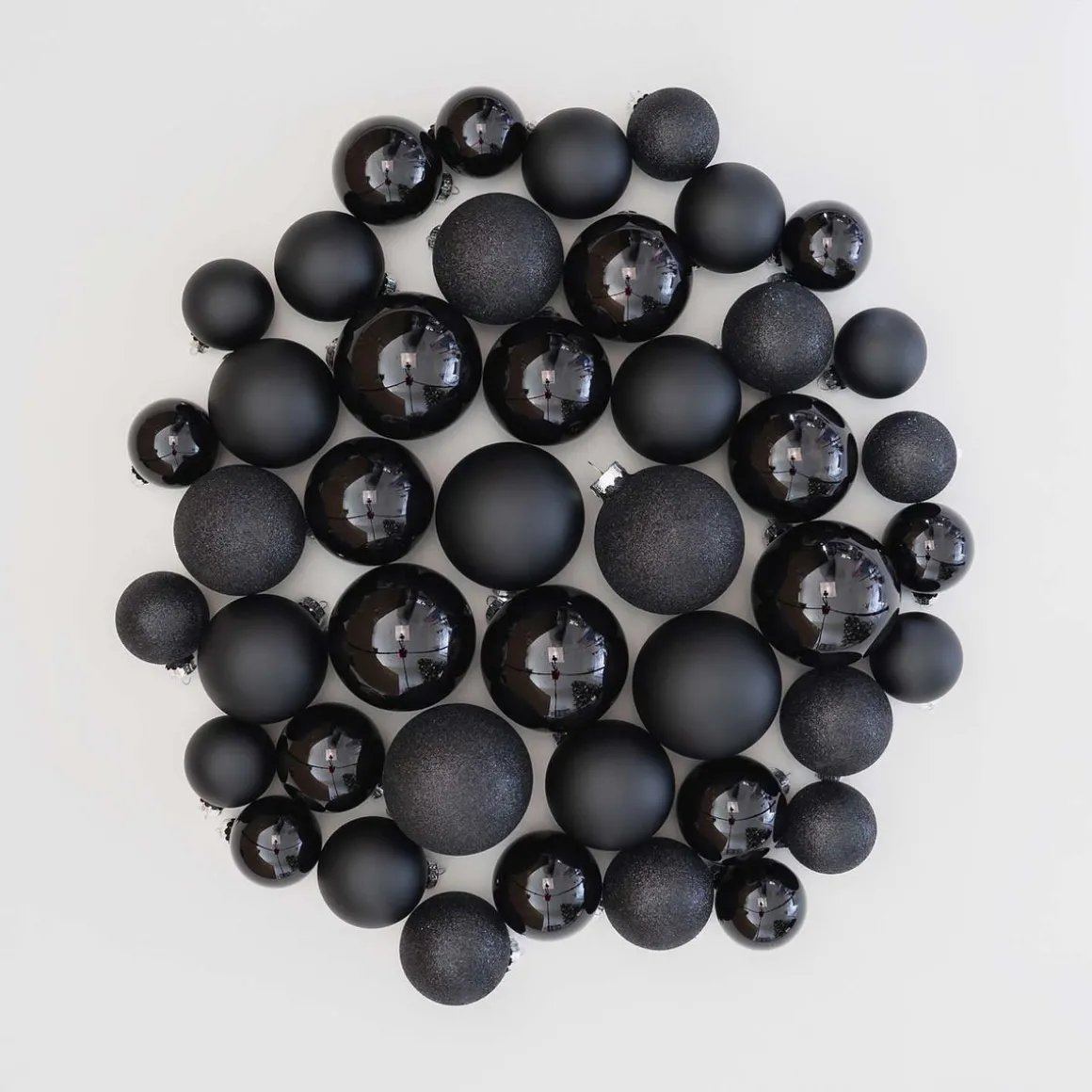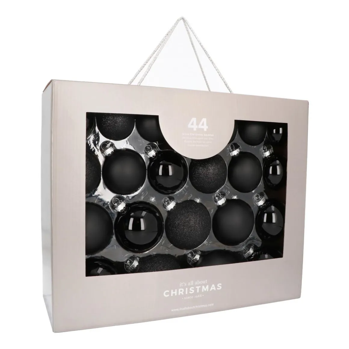 Hochwertiges Set aus 44 Weihnachtskugeln in Schwarz, hergestellt aus Glas. Enthalten sind matte, glänzende und glitzernde Kugeln in den Größen 5, 6, 7 und 8 cm. Dieses Weihnachtskugeln-Set befindet sich in einem praktischen Koffer mit Schnurgriff, in dem die Glaskugeln gut geschützt sind und platzsparend aufbewahrt werden können.