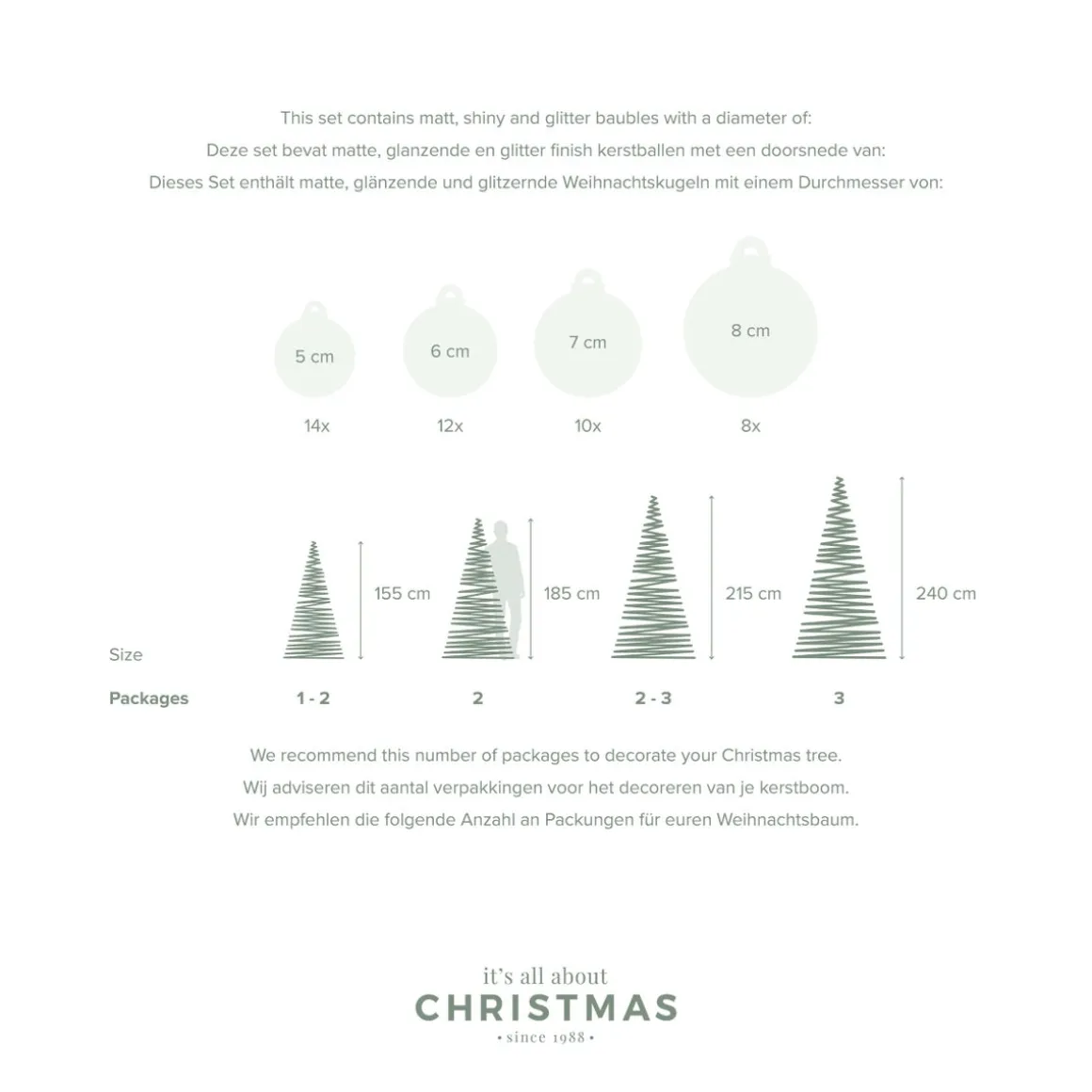 Um dem Weihnachtsbaum ein perfektes Aussehen zu geben, haben die Kugeln in diesem Set vier unterschiedliche Größen. Unterschiedlich große Christbaumkugeln sorgen für Abwechslung im Baum und lassen selbst bei einfarbigen Dekorationen jede einzelne Kugel besser zur Geltung kommen.