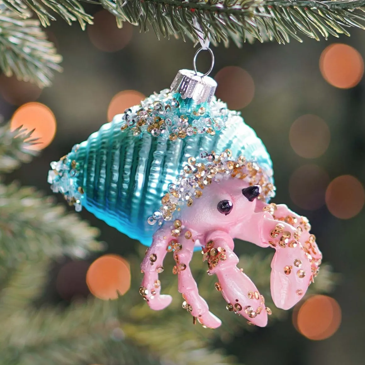 Ausgefallener Weihnachtsbaumanhänger Einsiedlerkrebs. Der hochwertige Christbaumschmuck aus Glas ist ca. 9 cm groß, vorwiegend rosa und blau gehalten und eines der absoluten Highlights unserer Weihnachtskollektion.