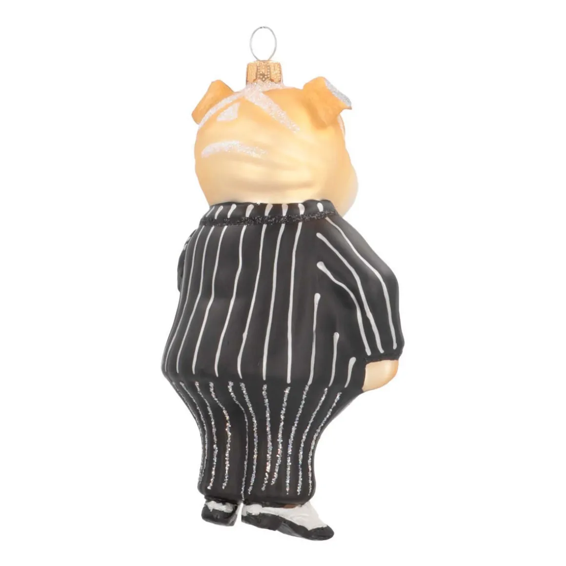 Im feinen, schwarzen Nadelstreifenanzug zeigt sich die englische Bulldogge, die zum Ausdruck bringt, wer am Tannenbaum das Sagen hat. Auch seine Krawatte und Lederschuhe sowie die dicke Zigarre unterstreichen das dekadente Auftreten des Hundes. Keine Frage, die Bulldogge zieht die Blicke auf sich und ist daher ein Gewinn für jeden Weihnachtsschmuck.