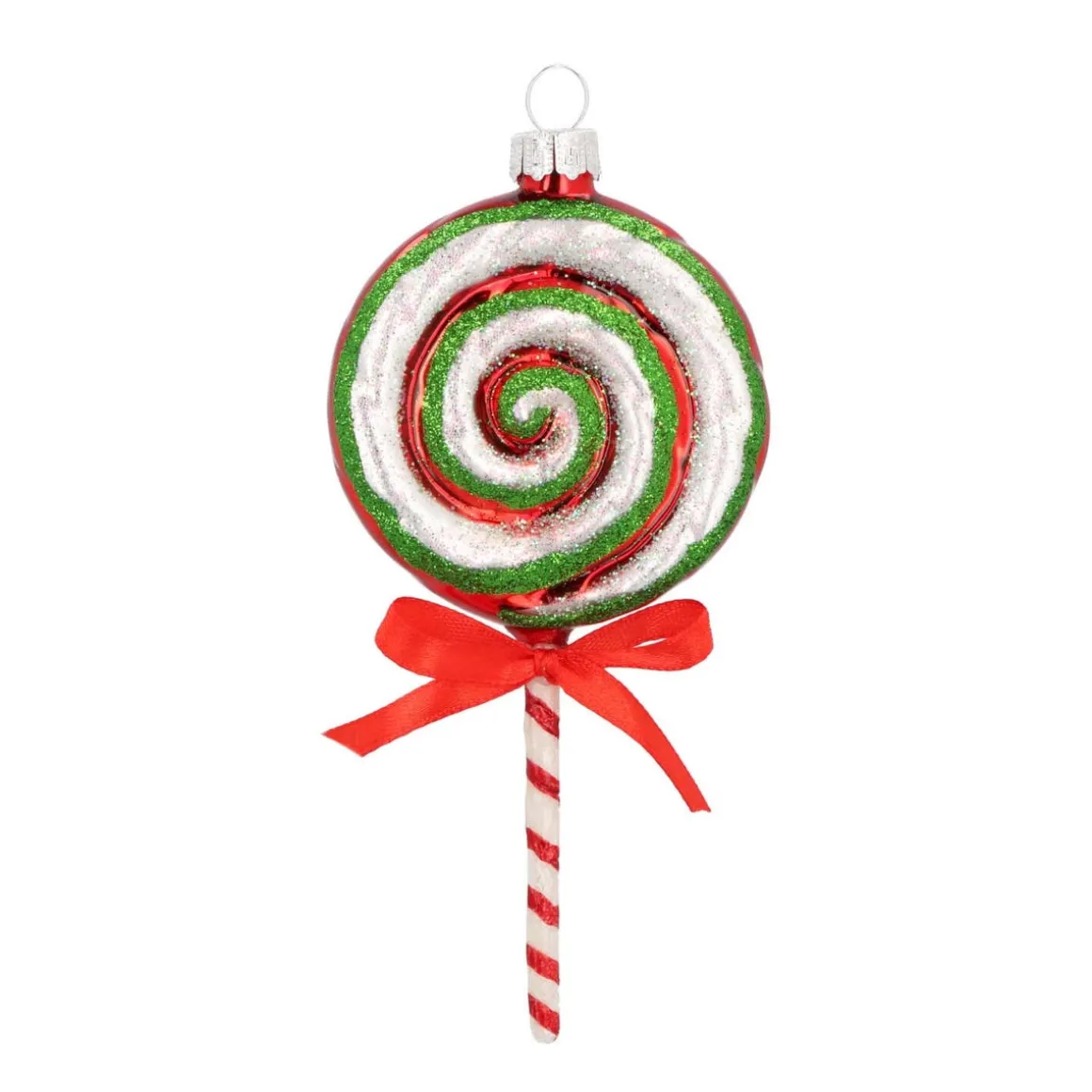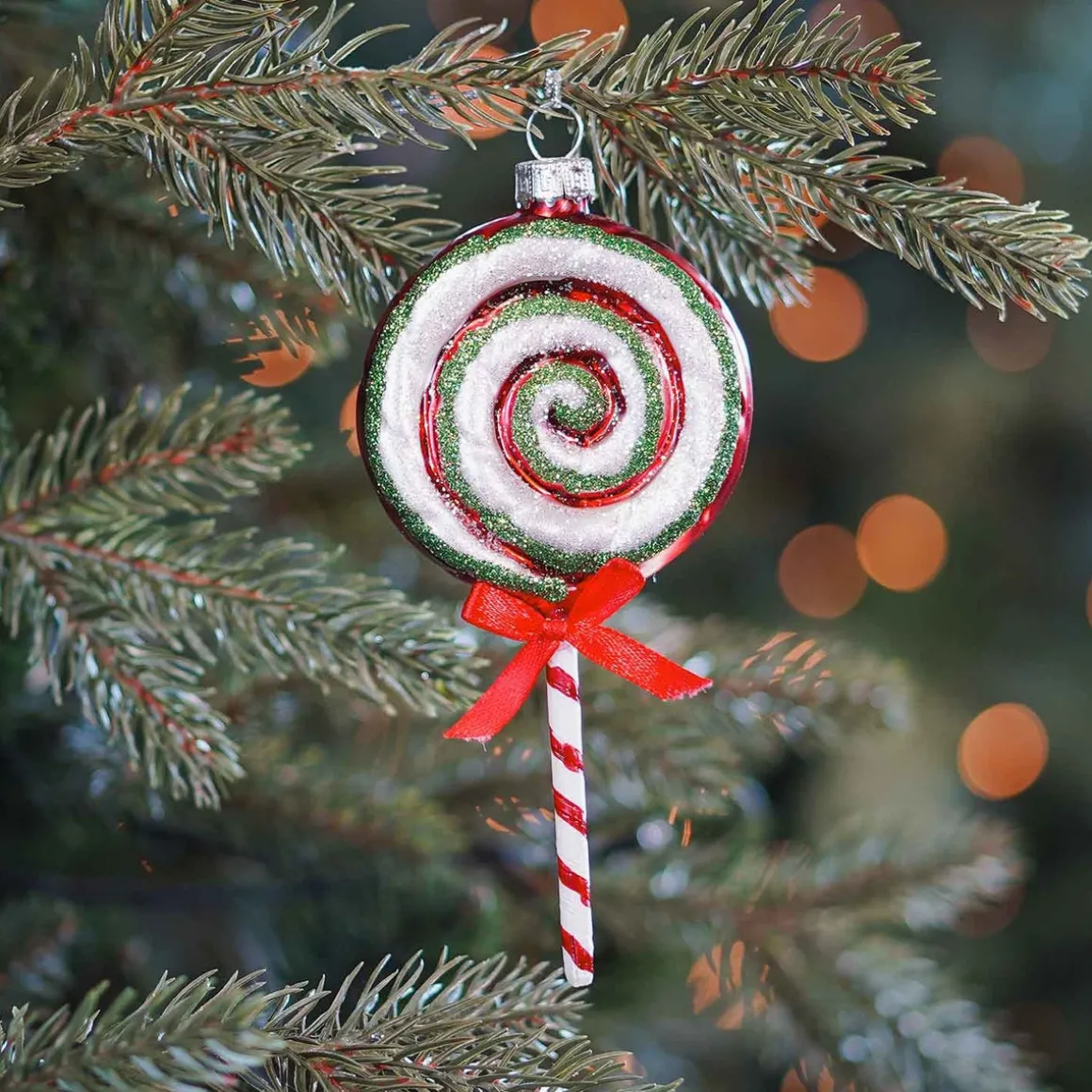 Luxuriöser Christbaumschmuck aus Glas. Mit dem traditionellen Lutscher als Weihnachtshänger bekommt der Tannenbaum einen süßen Eyecatcher. Dieses besondere Stück passt hervorragend zu amerikanischem Weihnachtsschmuck, klassischen Themen oder ausgefallenen Designs.