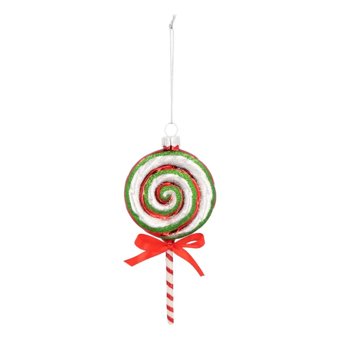 Rot, grün und weiß sind die Farben dieses Dauerlutscher-Anhängers, der rund 14 cm inklusive Stil misst und eine rote Schleife als i-Tüpfelchen besitzt. Insgesamt handelt es sich um einen Weihnachtsbaumanhänger, mit dem sich eine wahrlich weihnachtliche Atmosphäre kreieren lässt.