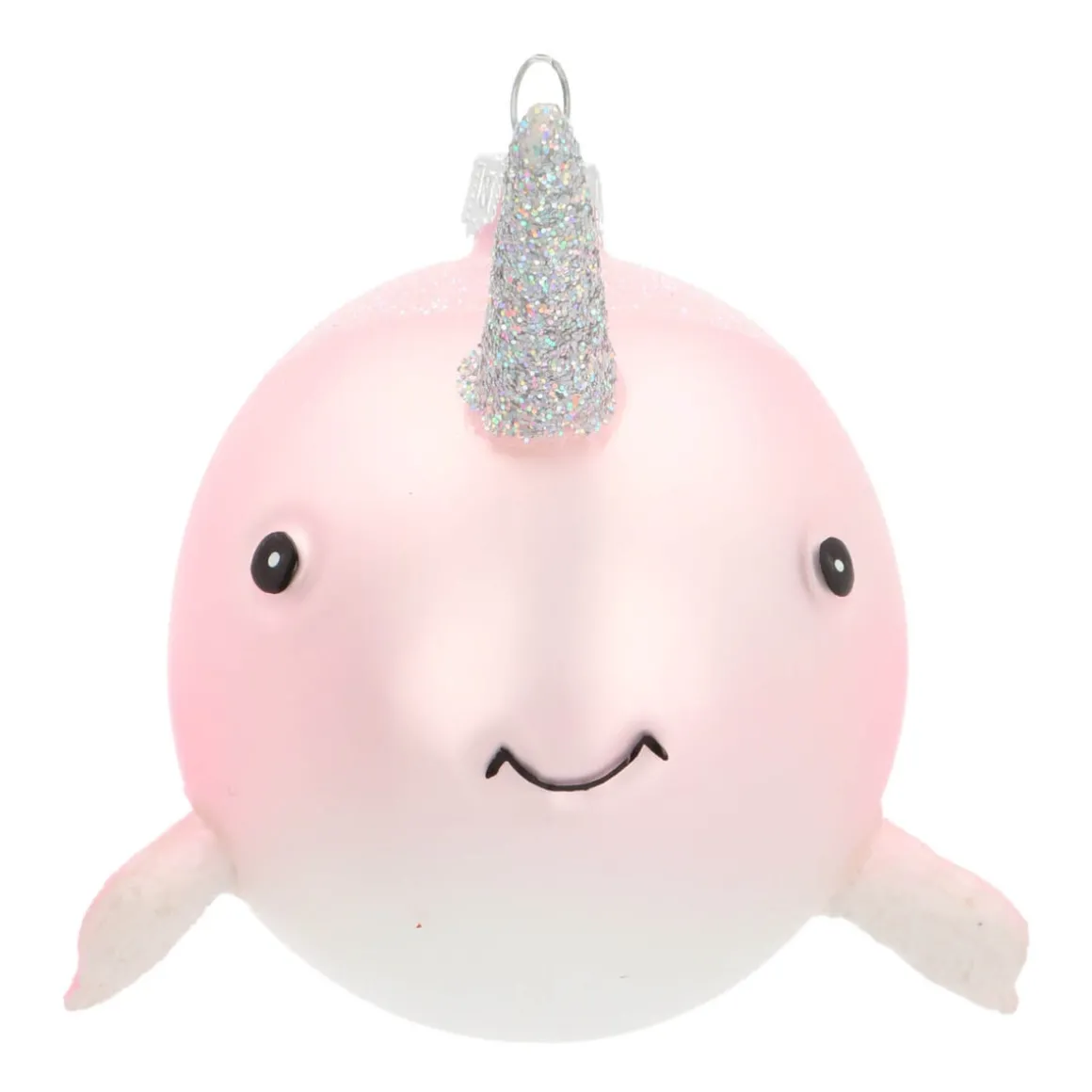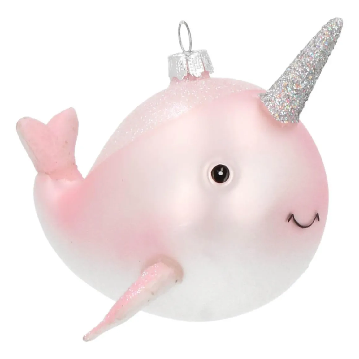 Luxuriöser Weihnachtsbaumanhänger Narwal in Rosa, hergestellt aus Glas. Der 10 cm große Narwal ist ein außergewöhnlicher Christbaumschmuck, daher ein absoluter Hingucker am Tannenbaum oder bei der Weihnachtsdeko.