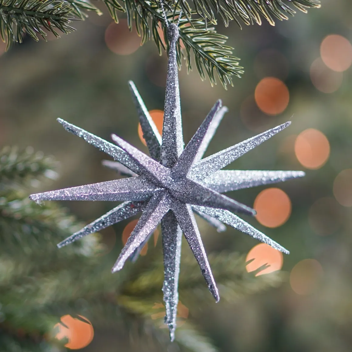 Besonderer Weihnachtsbaumanhänger Polarstern in Silber. Hergestellt aus Kunststoff, mit Glitzer versehen und 11 cm groß. Der elegante Christbaumschmuck ist die perfekte Ergänzung zu farbgleichen Weihnachtskugeln.