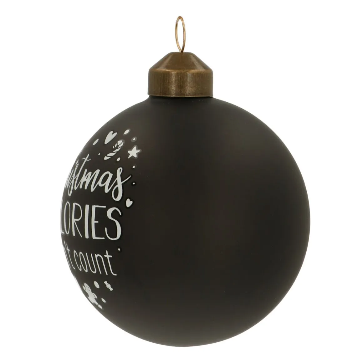 Bedruckte Weihnachtskugel mit der Aufschrift „Christmas Calories Don’t Count“. Die Kugel ist aus Glas hergestellt, 8 cm groß und in einem matten Schwarz gehalten.