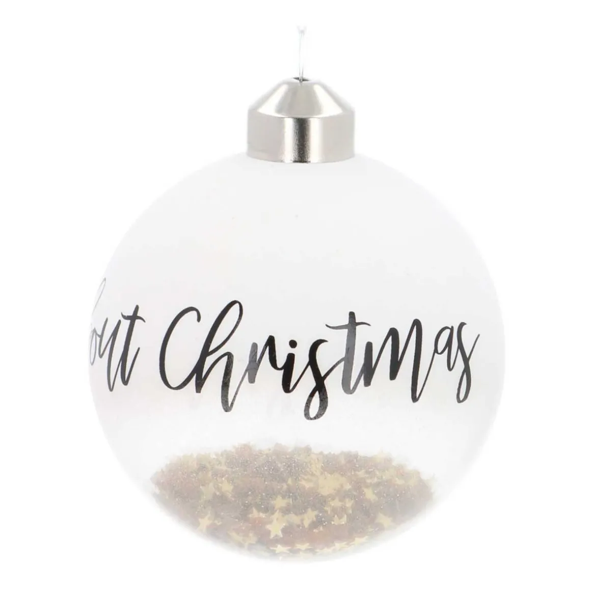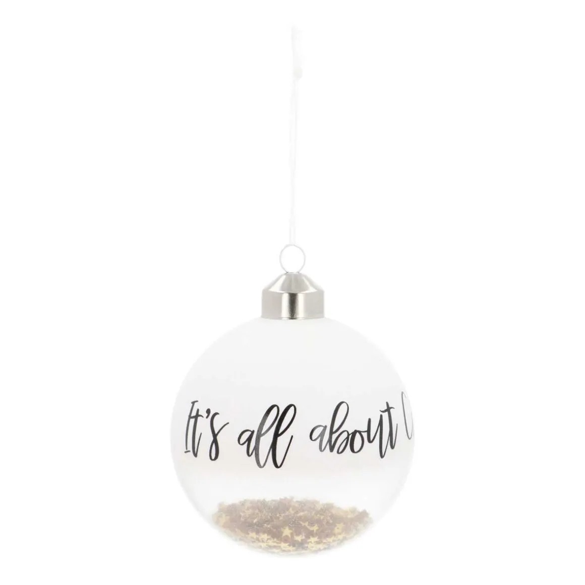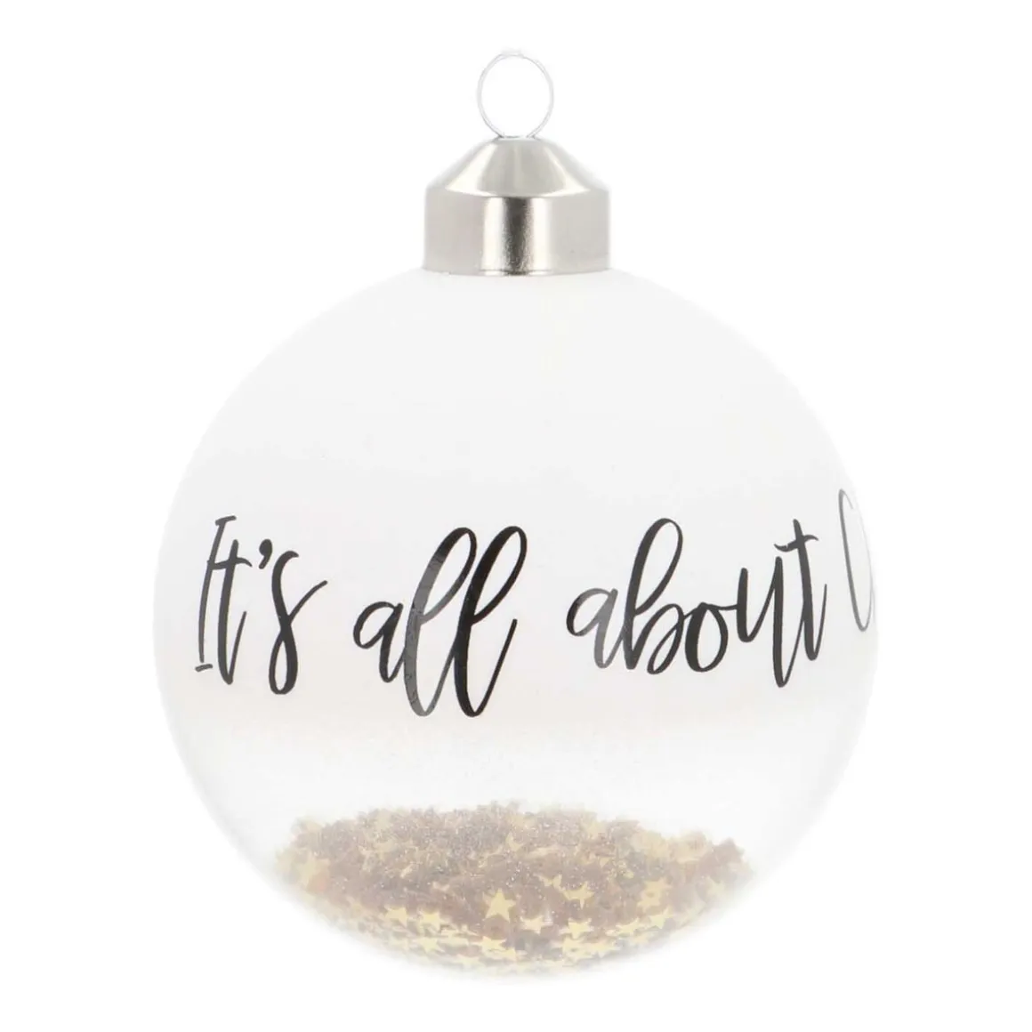 Bedruckte Weihnachtskugel mit der Aufschrift „It’s all about Christmas“. Die Kugel ist aus Glas hergestellt, 8 cm groß und hat eine transparent-frostige Oberfläche. Goldene Sterne im Inneren runden das Gesamtbild ab.