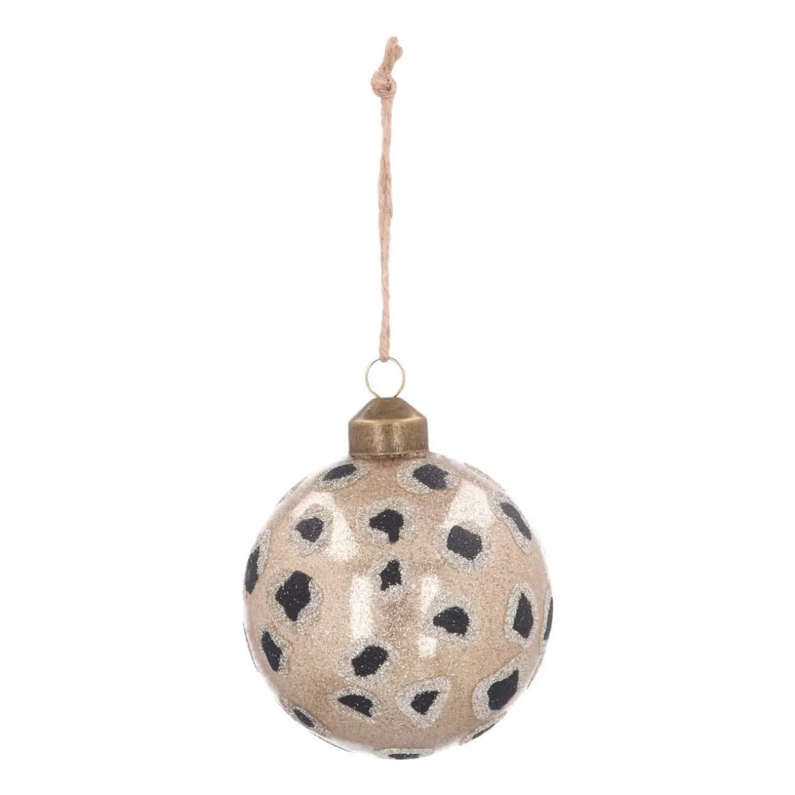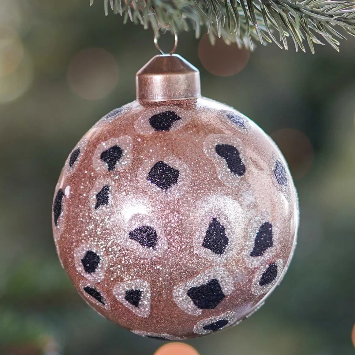 Außergewöhnliche Weihnachtskugel mit Leoprint, hergestellt aus echtem Glas. Die 8 cm große Christbaumkugel hat eine glitzernde, hellgoldene Oberfläche, während der Leoprint schwarz ist. Ein wilder wie trendiger Blickfang für den Weihnachtsbaum.