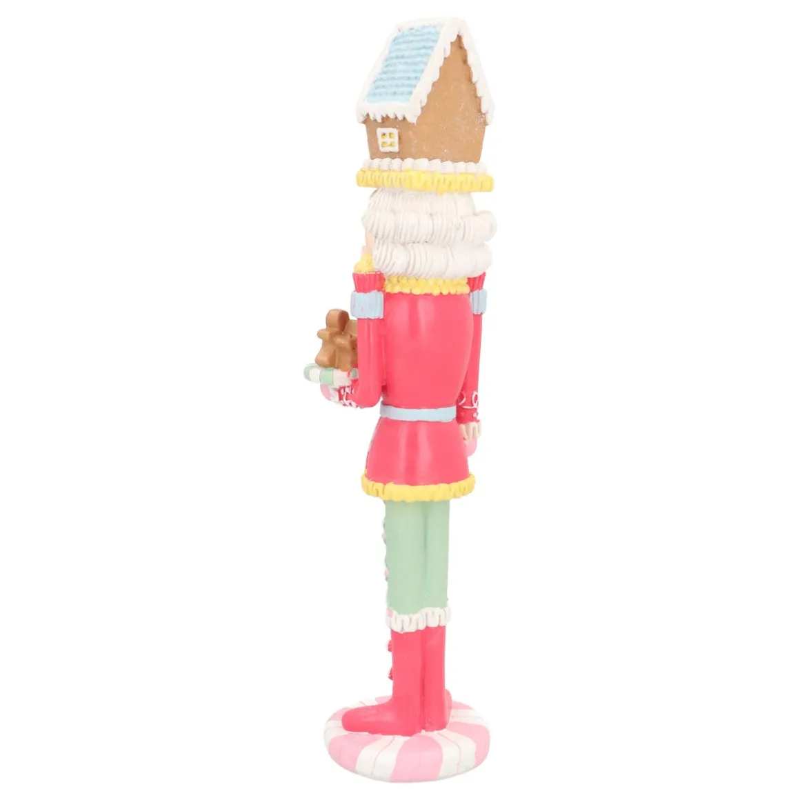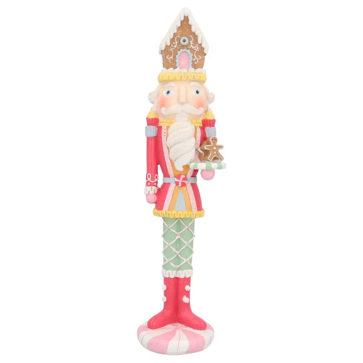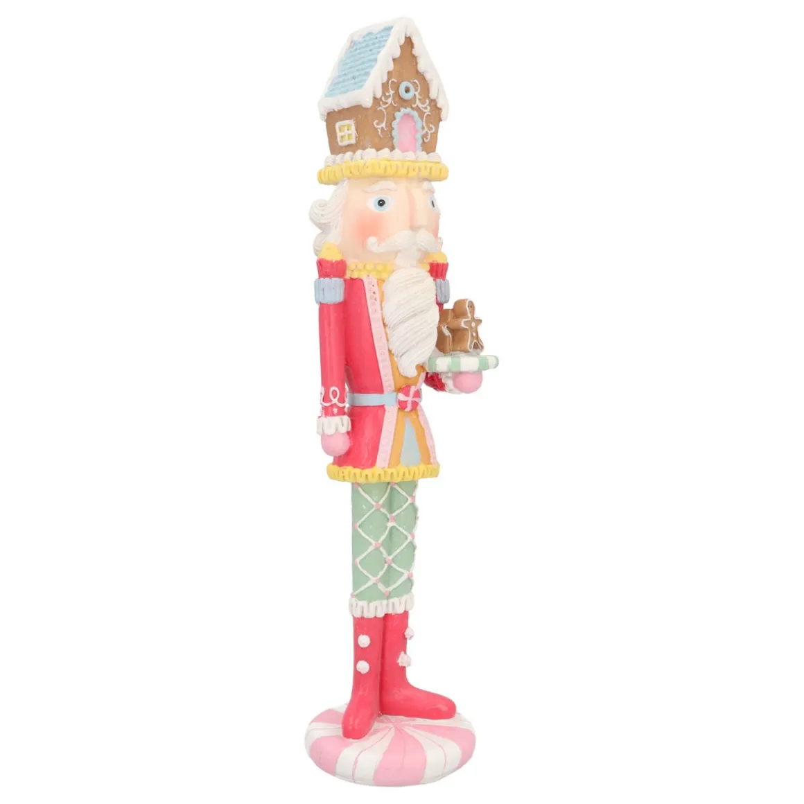 Ein Nussknacker in Pastelltönen ist wirklich ein Fest fürs Auge! Mit seinem Lebkuchenhaus auf dem Kopf und einem Tablett voller Lebkuchen-Köche bringt er sofort süße Weihnachtsstimmung in dein Zuhause. Unser Nussknacker ist 35 cm groß und aus robustem Polyresin in frischen und sanften Farben gefertigt. Der rosa Mantel und die hellgrüne Hose verleihen seinem Outfit einen fröhlichen und verspielten Touch. Und die Zuckerschicht? Die gibt ihm das gewisse Extra. Dieser hübsche Kerl sorgt garantiert für ein Lächeln!