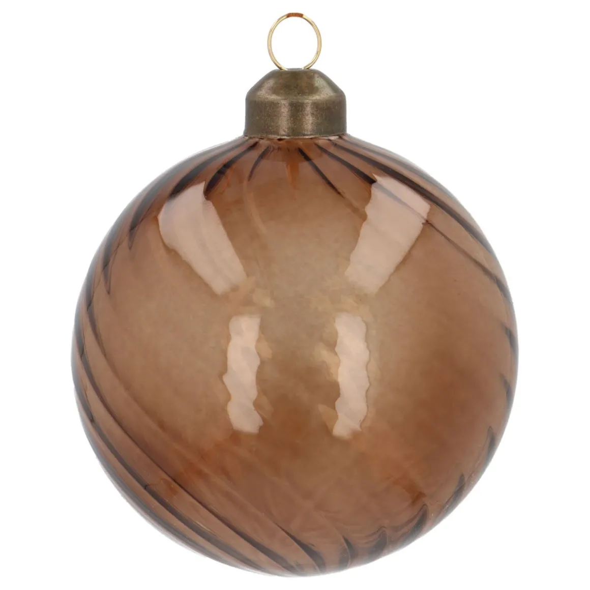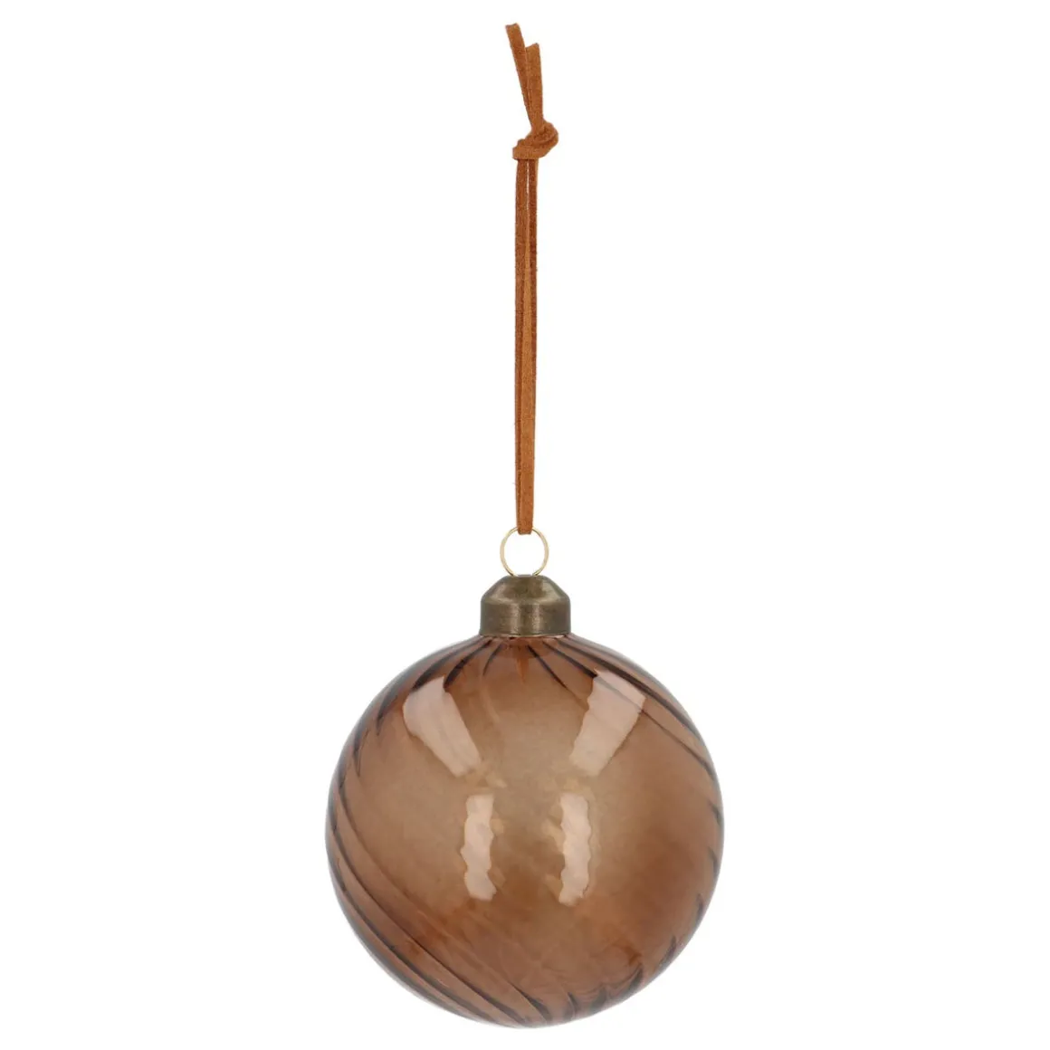 Dieses hellbraune Weihnachtsornament mit einem Durchmesser von 8 cm besteht aus halbtransparentem Glas, das im Licht deiner Weihnachtsbeleuchtung besonders schön funkelt. Wir können uns an den faszinierenden Linien im Glas einfach nicht sattsehen! Die subtilen gedrehten Wirbel verleihen der Weihnachstkugel zudem ein elegantes Aussehen. Mit dem Lederband hängst du sie dort auf, wo du möchtest.