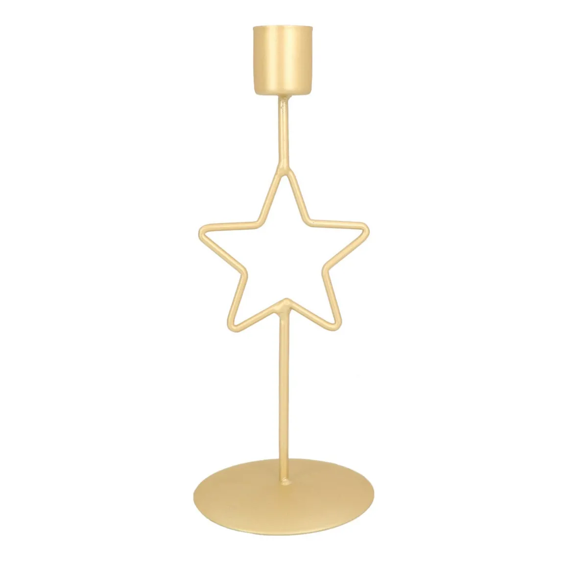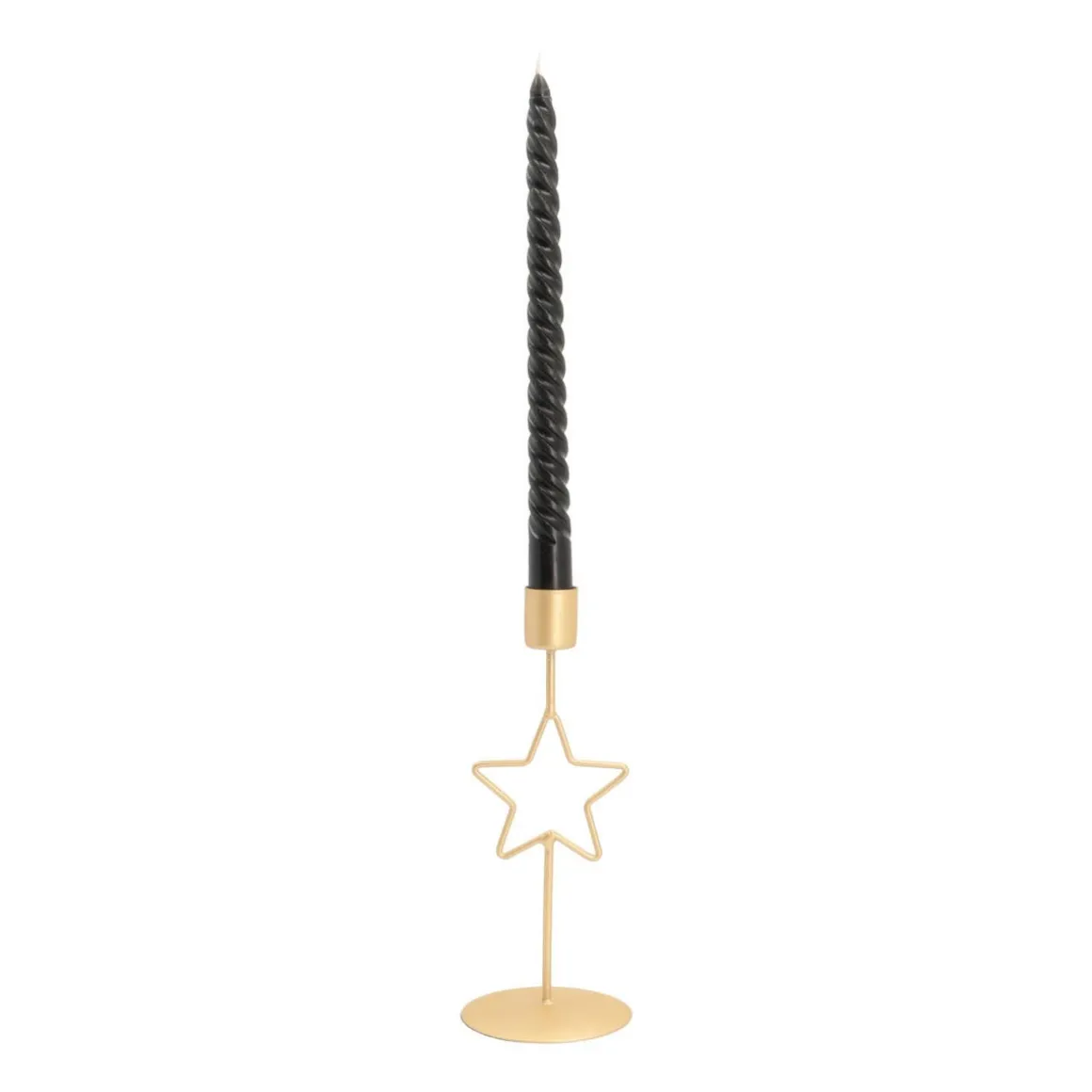 Edler Kerzenständer aus Metall. Mit der Kombination aus Stern-Design und matt-goldenem Finish bringt er Glanz in jedes Wohndesign. Der Kerzenhalter ist 20 cm hoch und eignet sich für Stabkerzen mit 2 cm Durchmesser.