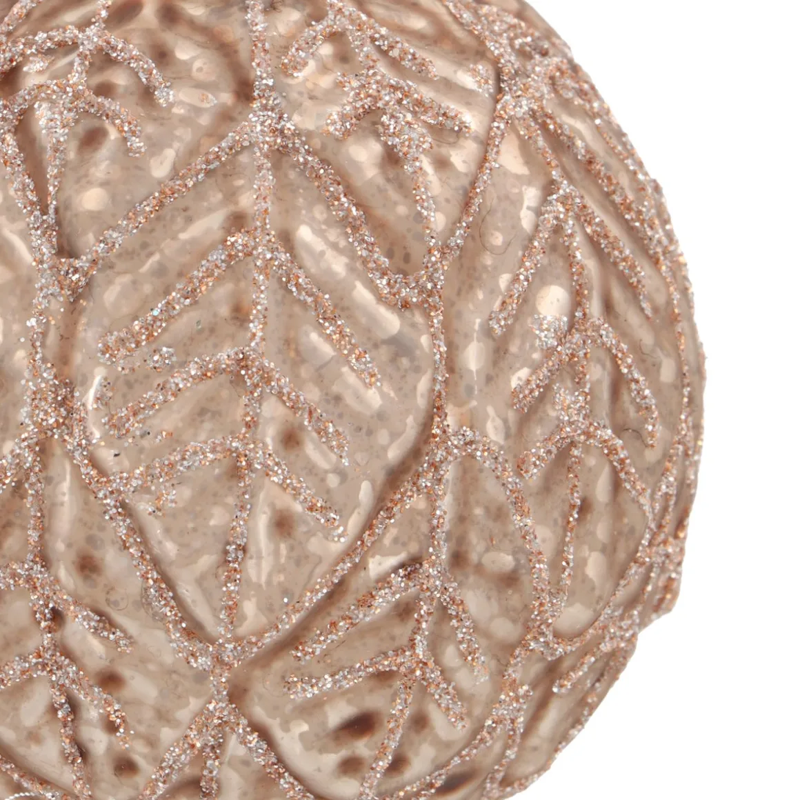 Diese nostalgische braune Weihnachtskugel hat ein detailliertes Blattmuster, das das Licht auf besondere Weise reflektiert. Die Kombination aus dem halbtransparenten Glas und den subtilen Glitzern sorgt für ein warmes und stimmungsvolles Ambiente. Perfekt zum Kombinieren mit Naturtönen und natürlichen Materialien wie Holz, für einen gemütlichen und nostalgischen Weihnachtsbaum.
