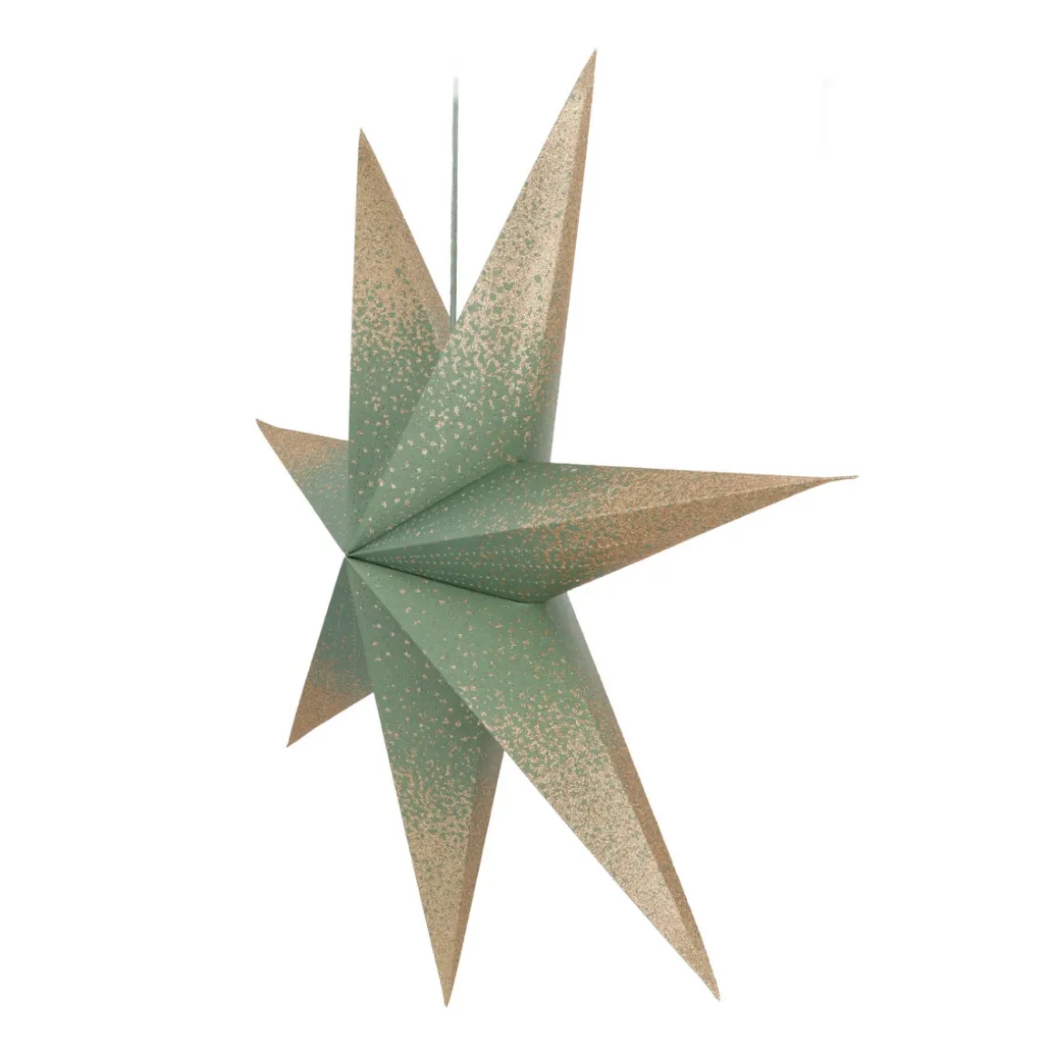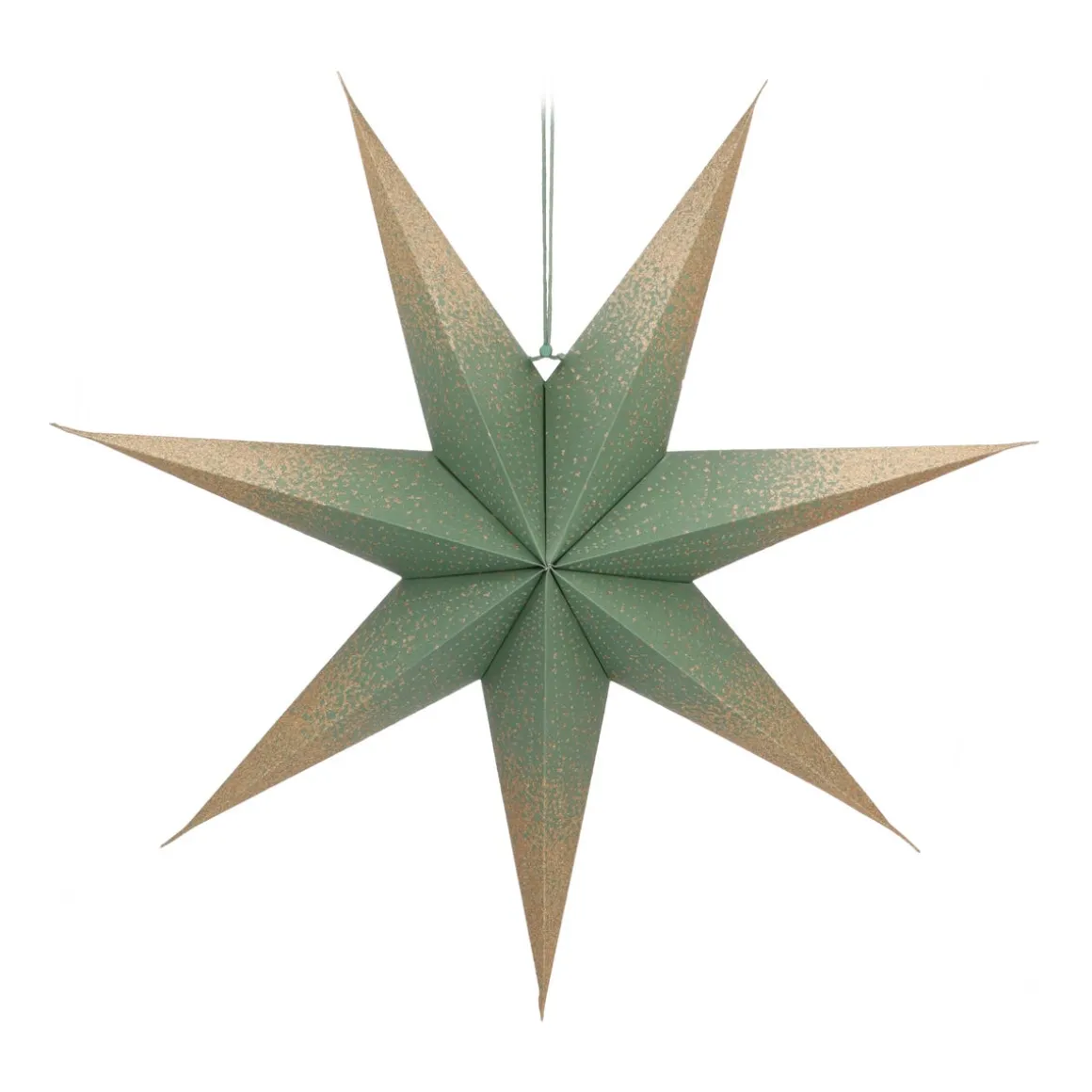 Wunderschöner Papierstern in Grün zur festlichen Dekoration in der Weihnachtszeit. Beleuchtet zeigt der 60 cm große 7-Zacken-Stern seine ganze Strahlkraft. Einfach eine Lampe einhängen, einschalten und schon dringt Licht durch das Transparentpapier und Lochmuster des Sterns nach außen.