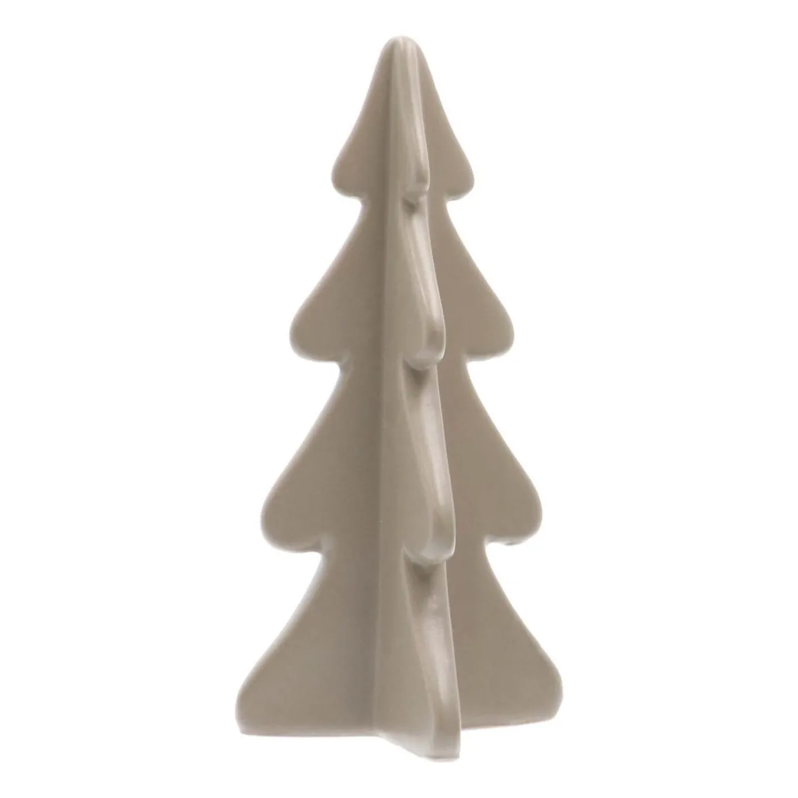 Moderner Deko-Tannenbaum aus Porzellan. Die Tanne hat eine matt-taupefarbene Oberfläche und ist circa 21 cm groß. Mit ihrem schlichten, eleganten 3D-Design eignet sie sich wunderbar zur Weihnachtsdeko auf Tisch oder Fensterbank.