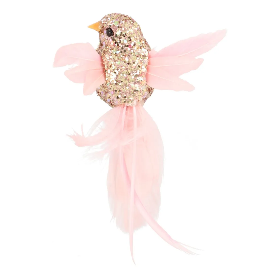 Dieses süße Vögelchen aus leichtem Kunststoff ist mit funkelnden Pailletten und Glitzer versehen. Mit seinen ausgestreckten rosa Flügeln und dem Schwanz aus echten Federn sieht es aus, als könnte es jeden Moment davonfliegen. Der funkelnde Körper und die niedlichen Augen ziehen garantiert die Aufmerksamkeit auf sich!