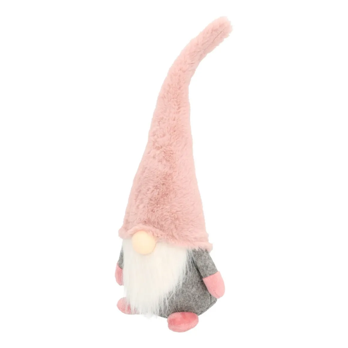 Niedliche Weihnachtsdekoration in Form eines Weihnachtswichtels mit rosa Mütze und weißem Bart. Die Mütze ist bis über die Augen gezogen, sodass von seinem Gesicht nur die dicke Nase zu sehen ist. Der Wichtel ist 35 cm groß und aus Stoff produziert.