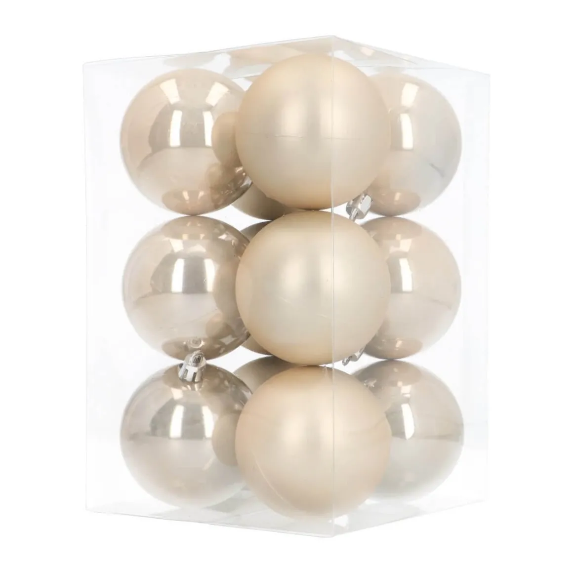 Champagner Christbaumkugeln aus Kunststoff à 7 cm in der praktischen 12er Packung. Enthalten sind matte und glänzende Weihnachtskugeln. Einfach mit anderen Farben und Größen zu kombinieren. Weil aus Kunststoff produziert, sind die Kugeln nahezu unzerbrechlich. Farbkategorie: Champagner.