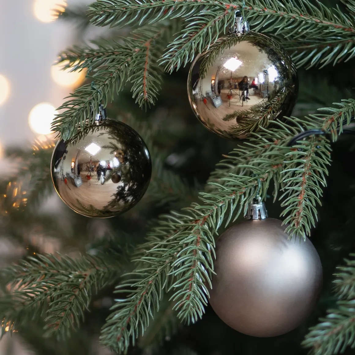 Taupe Christbaumkugeln aus Kunststoff à 7 cm in der praktischen 12er Packung. Enthalten sind matte und glänzende Weihnachtskugeln. Einfach mit anderen Farben und Größen zu kombinieren. Weil aus Kunststoff produziert, sind die Kugeln nahezu unzerbrechlich. Farbkategorie: Taupe.