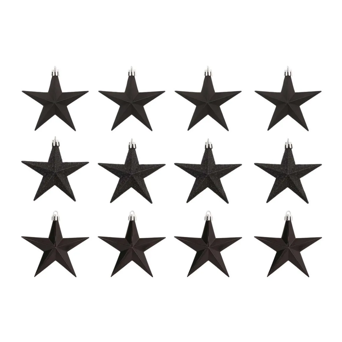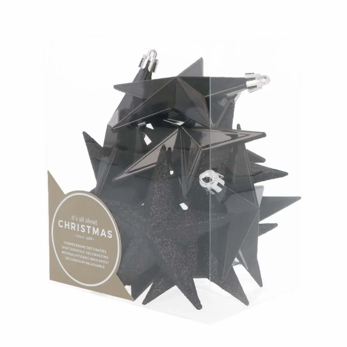 Schwarze Weihnachtssterne zum Aufhängen mit einer Größe von 10 cm – 12 Stück pro Verpackung. Hergestellt aus Kunststoff, daher nahezu unzerbrechlich. Die Sterne können mit anderem Christbaumschmuck in verschiedenen Formen, Größen und Farben wunderbar kombiniert werden. Farbkategorie: Schwarz.