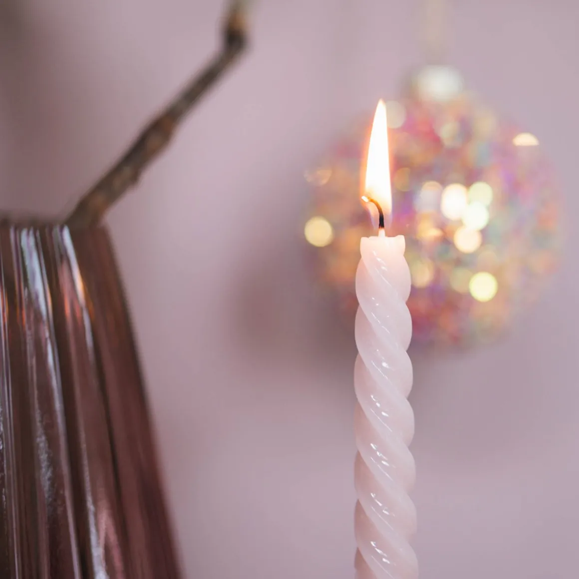 Stilvolles Set aus 4 gedrehten Kerzen in Rosa. Jede Kerze ist 25 cm groß und hat einen Durchmesser von 2,2 cm, womit sie für gänginge Kerzenständer geeignet sind. Die Brenndauer beträgt ungefähr 6 Stunden.