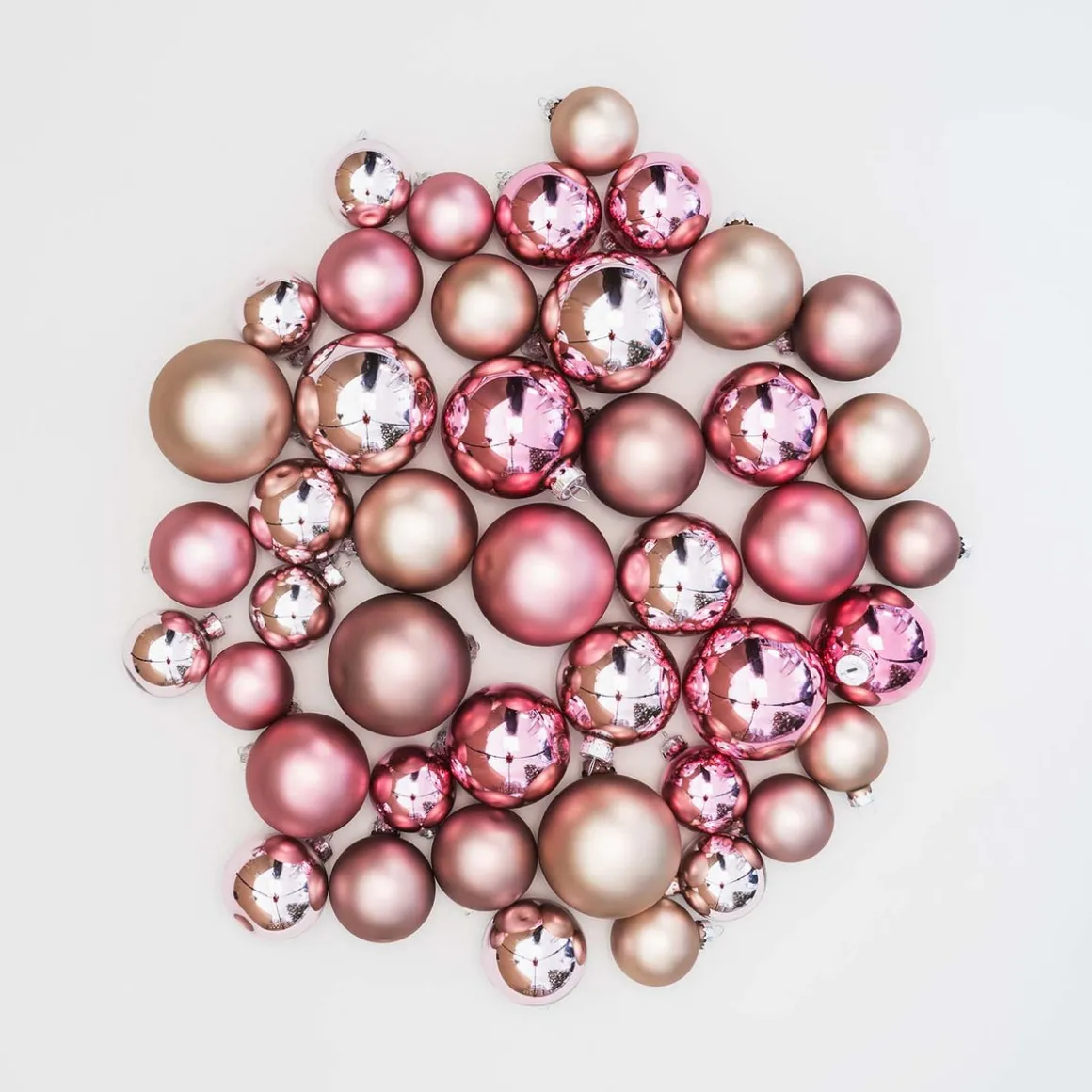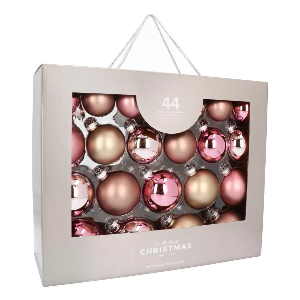 Hochwertiges Set aus 44 Weihnachtskugeln in Altrosa und Taupe, hergestellt aus Glas. Enthalten sind matte und glänzende Kugeln in den Größen 5, 6, 7 und 8 cm. Dieses Weihnachtskugeln-Set befindet sich in einem praktischen Koffer mit Schnurgriff, in dem die Glaskugeln gut geschützt sind und platzsparend aufbewahrt werden können.