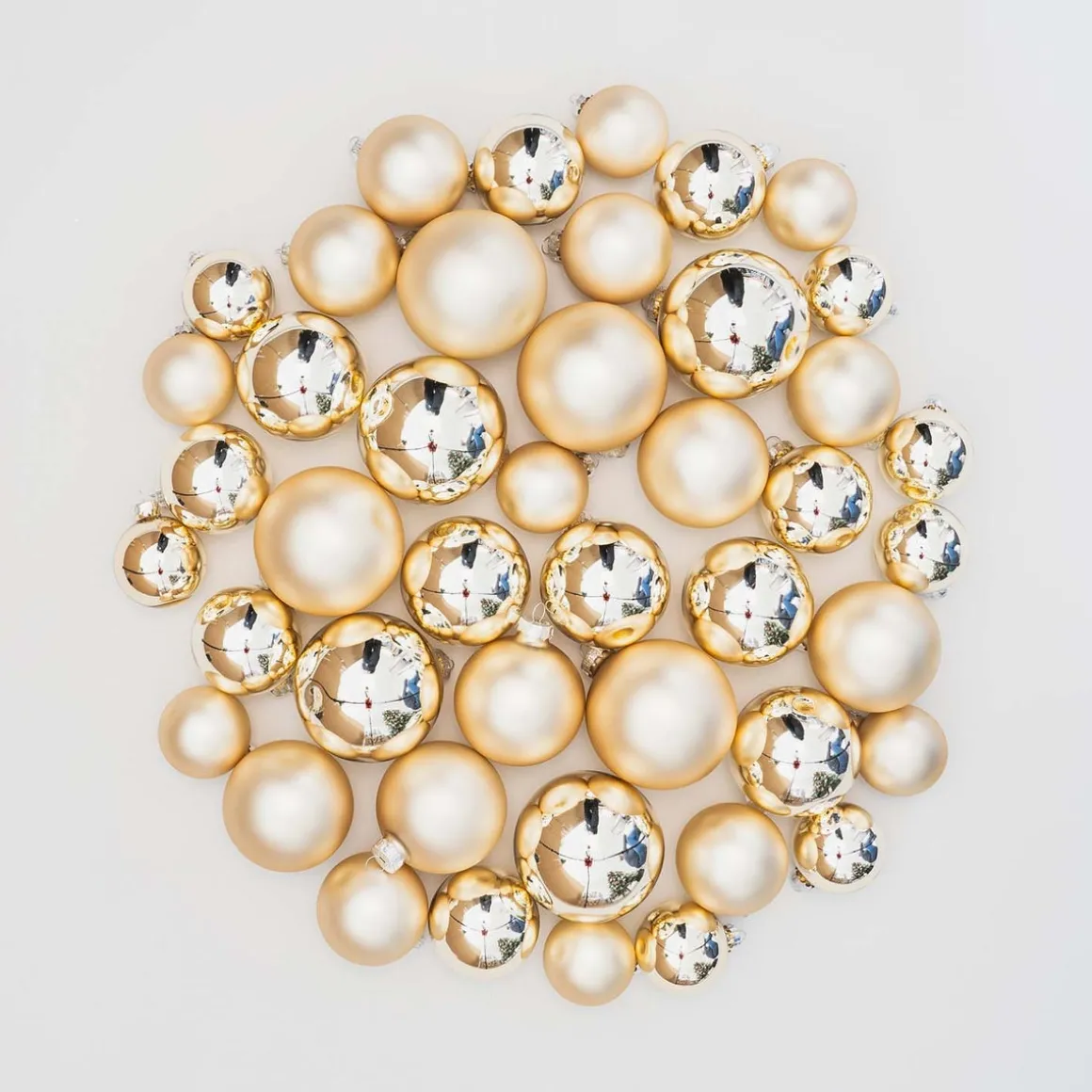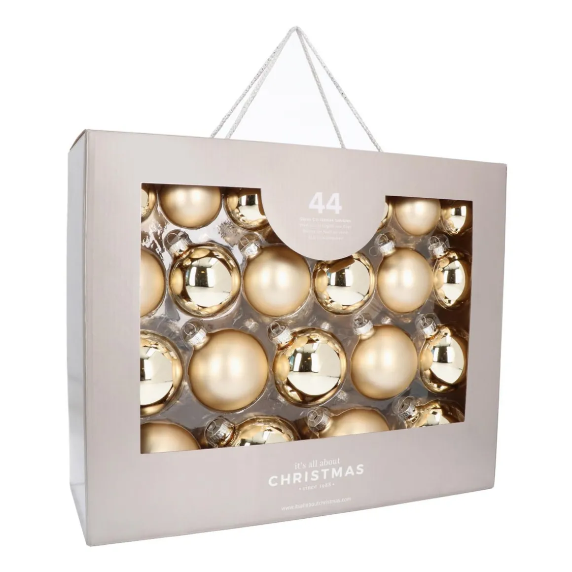Hochwertiges Set aus 44 Weihnachtskugeln in hellem Gold, hergestellt aus Glas. Enthalten sind matte und glänzende Kugeln in den Größen 5, 6, 7 und 8 cm. Dieses Weihnachtskugeln-Set befindet sich in einem praktischen Koffer mit Schnurgriff, in dem die Glaskugeln gut geschützt sind und platzsparend aufbewahrt werden können.