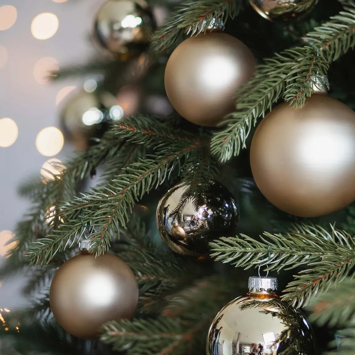 Für eine optimale Verteilung werden die größeren Kugeln in den unteren Bereich der Tanne und näher zum Stamm gehängt. So entsteht Tiefe. Außerdem heben sich größere Kugeln deutlicher vom dichteren Tannenkleid ab, das sich meistens weiter unten am Baum befindet. Die kleineren Kugeln erzielen die größere Wirkung im oberen Bereich der Tanne und vorne an den Zweigspitzen.