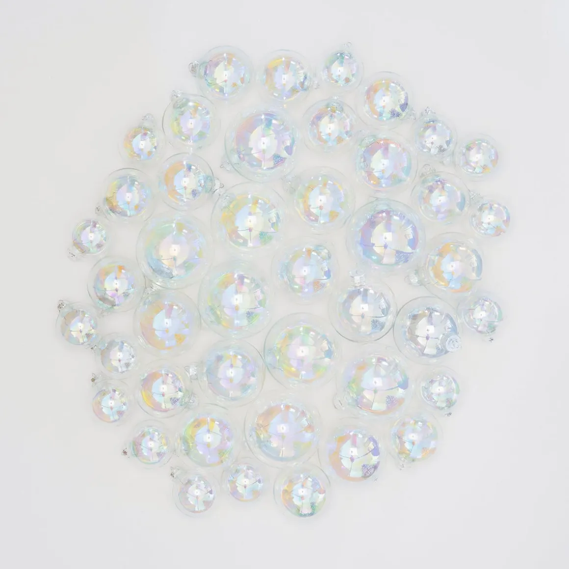 Hochwertiges Set aus 44 Weihnachtskugeln in Seifenblasen-Optik, hergestellt aus Glas. Enthalten sind transparente Kugeln in den Größen 5, 6, 7 und 8 cm, die den bunten Schimmer wie Seifenblasen aufweisen. Dieses Weihnachtskugeln-Set befindet sich in einem praktischen Koffer mit Schnurgriff, in dem die Glaskugeln gut geschützt sind und platzsparend aufbewahrt werden können.