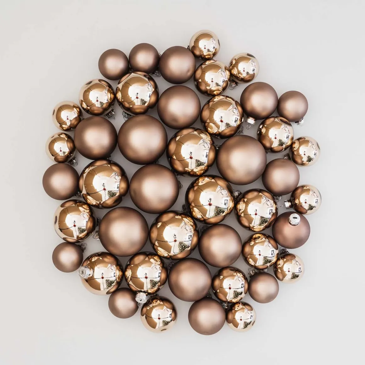 Hochwertiges Set aus 44 Weihnachtskugeln in Taupe, hergestellt aus Glas. Enthalten sind matte und glänzende Kugeln in den Größen 5, 6, 7 und 8 cm. Dieses Weihnachtskugeln-Set befindet sich in einem praktischen Koffer mit Schnurgriff, in dem die Glaskugeln gut geschützt sind und platzsparend aufbewahrt werden können.