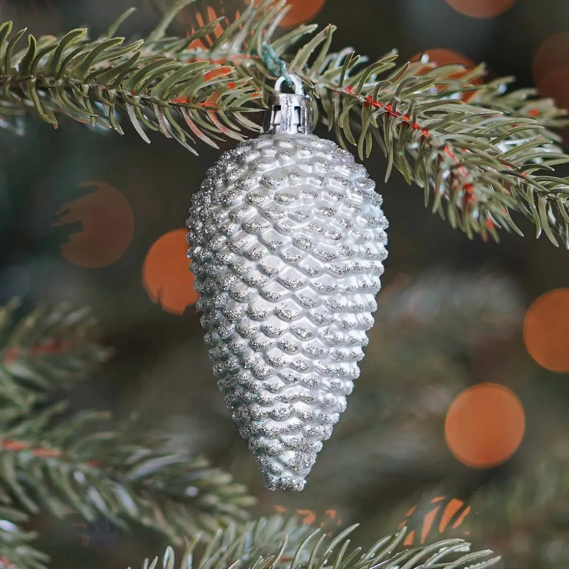 Set aus 6 dekorativen Tannenzapfen in Eukalyptus. Die Kunststoff-Zapfen sind ungefähr 9 cm groß. Einfach mit Christbaumschmuck in anderen Formen, Farben und Größen kombinieren.