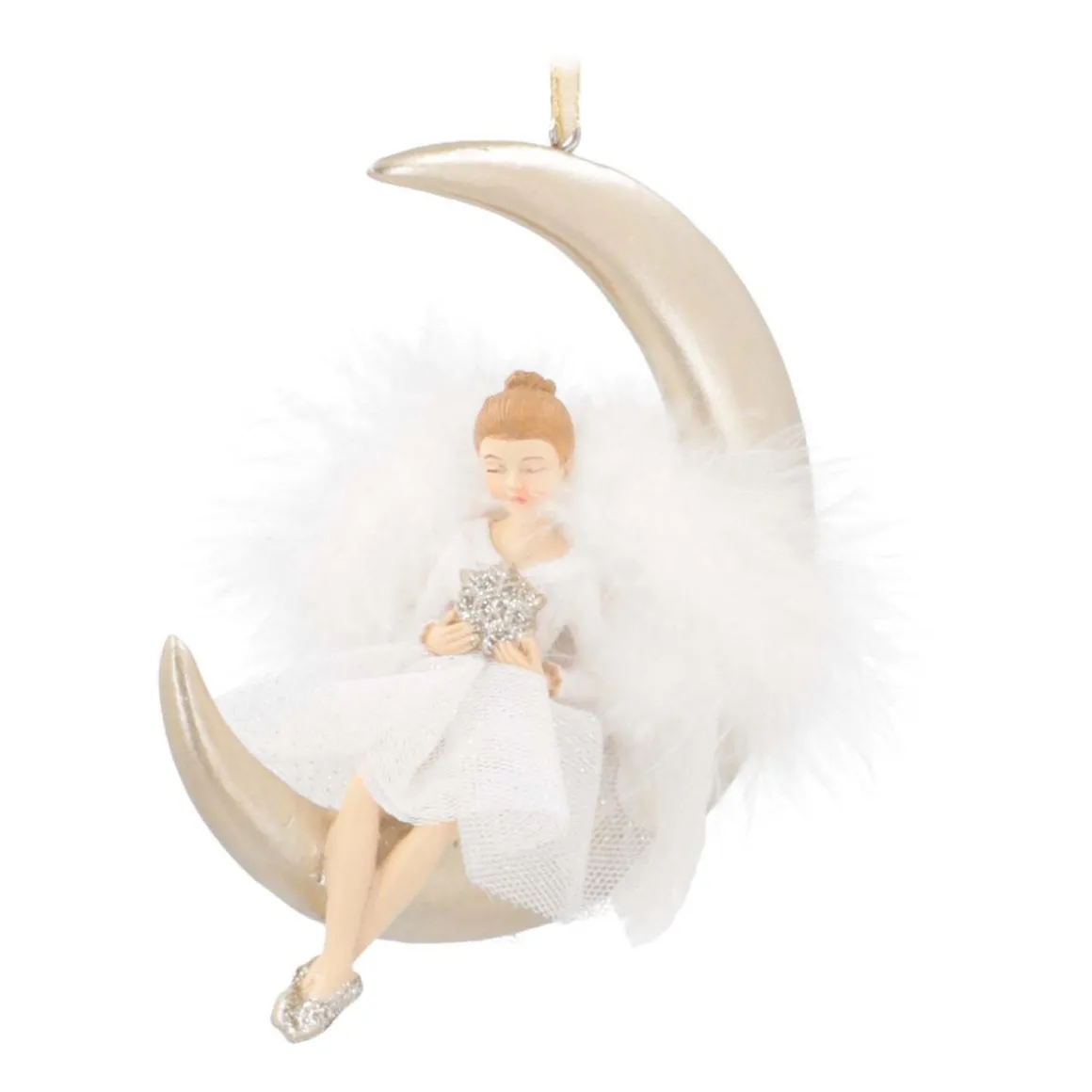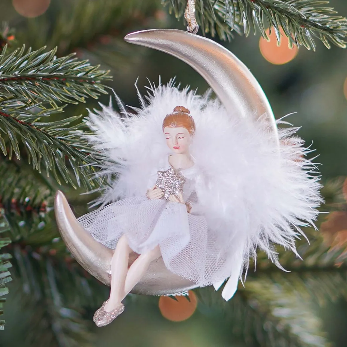 Ein klassisches Motiv für einen Weihnachtsbaumanhänger, welches Emotionen weckt. Bei diesem zauberhaften Christbaumschmuck sitzt ein weißer Engel auf dem Mond und hält einen Stern in den Händen. Eine rührende Szene, die schön anzusehen ist und dem Betrachter gleich ins Auge springt. Hergestellt ist der rund 13 cm große Anhänger aus Polyresin, was sein hochwertiges Aussehen erklärt.