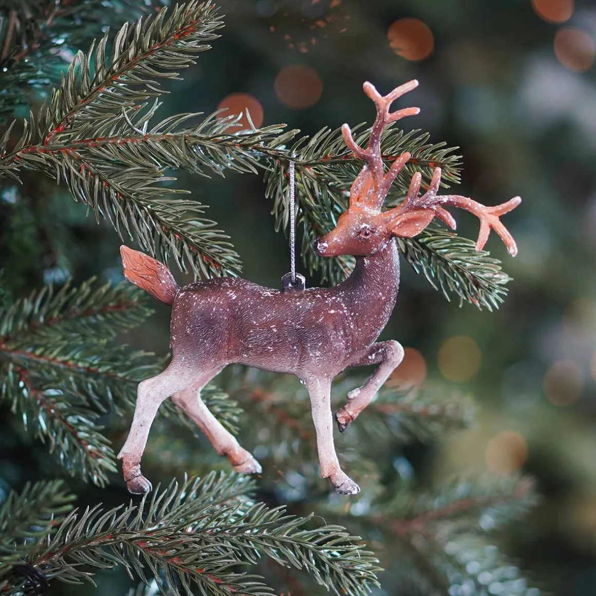 Authentischer Weihnachtsbaumanhänger eines Hirsches. Im naturgetreuen Braun gehalten, mit markantem Geweih und umschauender Haltung wird er zum besonderen Accessoire im Weihnachtsbaum. Die Figur ist leicht mit Glitzer versehen, aus Kunststoff hergestellt und etwa 15 cm groß.