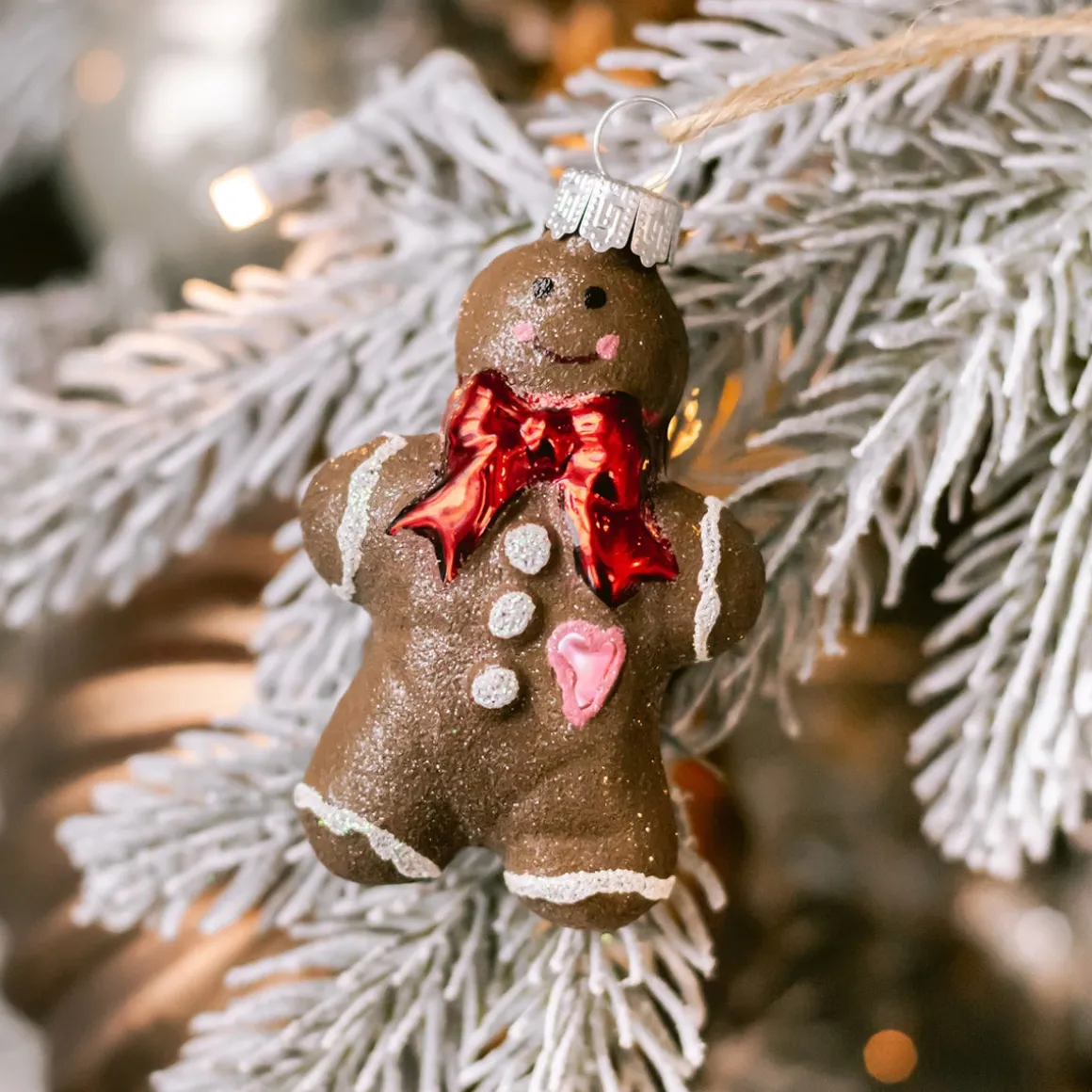Süßer Weihnachtsbaumanhänger Lebkuchenfigur, hergestellt aus Glas. Mit dem 8 cm großen Lebkuchenmann erhalten Tannenbaum oder Weihnachtsdeko einen Blickfang zum Anbeißen.