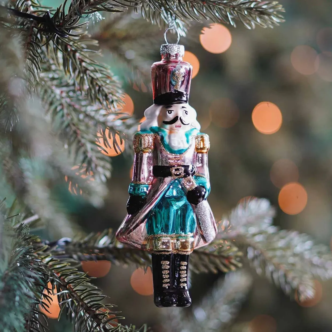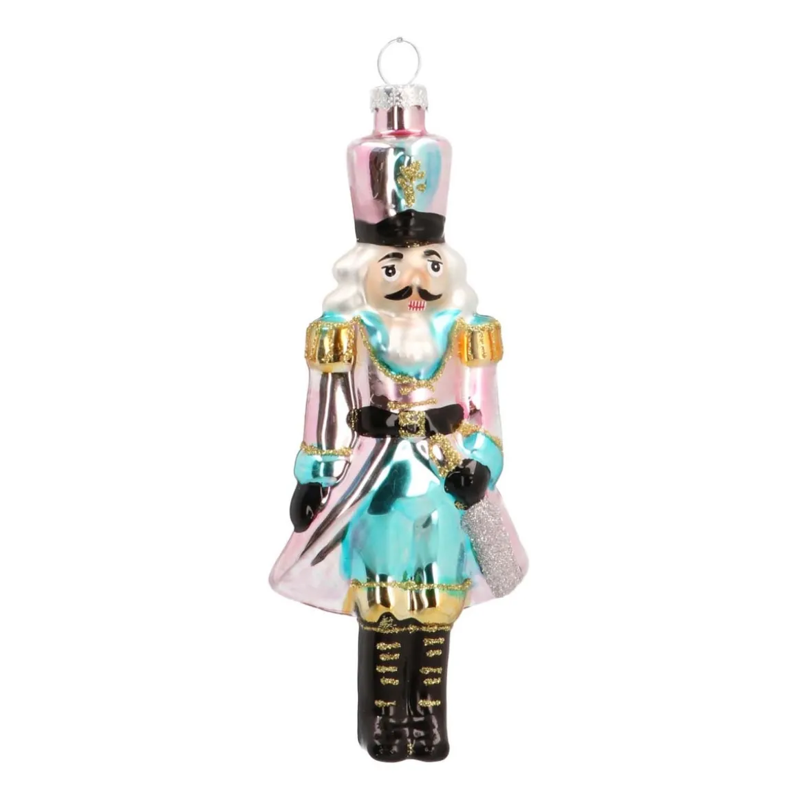 Ausgefallener Weihnachtsbaumanhänger aus Glas. Der Nussknacker-König in glänzenden Pastellfarben ist ein außergewöhnlicher Blickfang am Weihnachtsbaum. Er passt hervorragend zu extravaganten Weihnachtsdekorationen, fühlt sich farblich aber ebenso bei romantischen Themen zuhause.