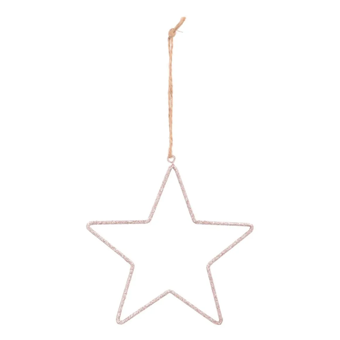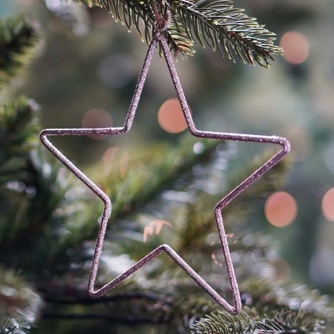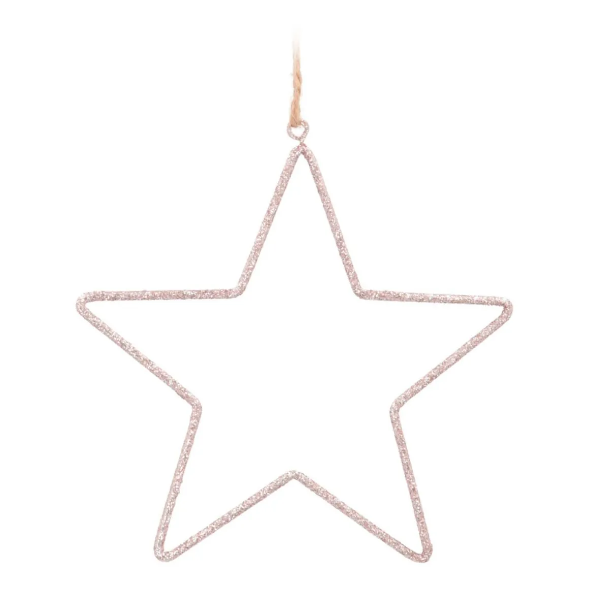 Stylisher Stern-Anhänger aus Metall, versehen mit rosafarbenem Glitzer. Mit einer Größe von rund 14 cm setzt der Stern am Tannenbaum ein Ausrufezeichen.