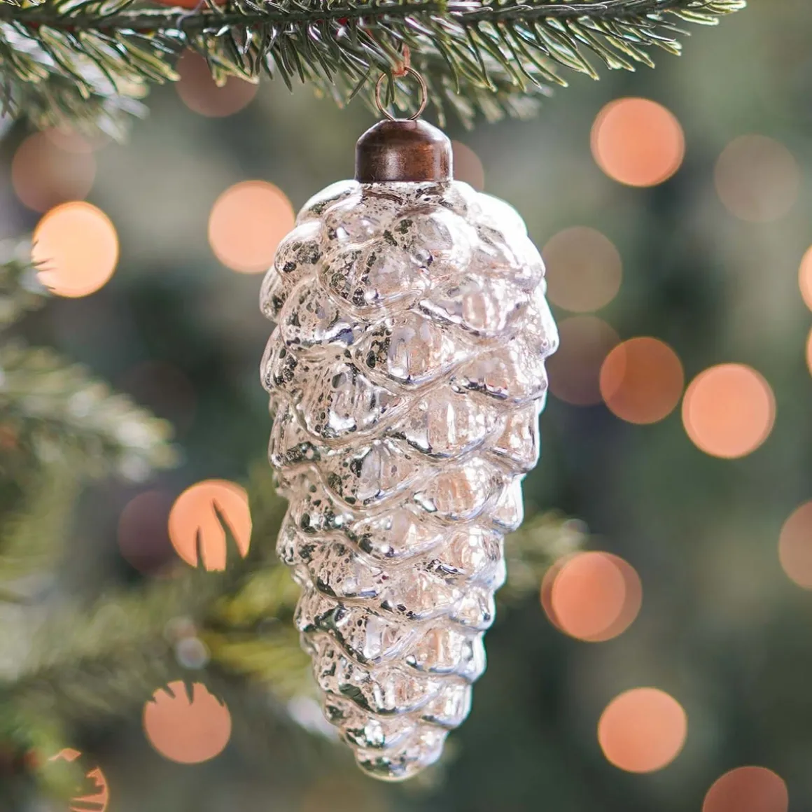 Einen eleganten Christbaumschmuck für den Weihnachtsbaum mimt dieser Tannenzapfen aus hochwertigem Glas. Neben seiner authentischen Form fällt seine Oberfläche sofort ins Auge. Diese glänzt in silberner Farbe und zeigt ein tolles Krakelee und sie ist obendrein auch noch durchsichtig. Das bedeutet, dass der Tannenzapfen den Schein der Weihnachtsbaumbeluchtung spiegelt sowie durchlässt.