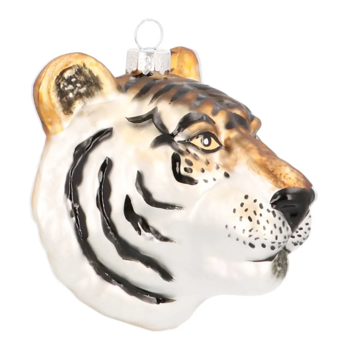 Ein Blick in die gelben Augen des Tigers genügt, um von diesem besonderen Christbaumschmuck begeistert zu sein. Der prächtige Tigerkopf ist braun-weiß gehalten und mit schwarzen Streifen versehen. Dieser Artikel hat eine ganze besondere Ausstrahlung und wertet jede Dekoration auf.