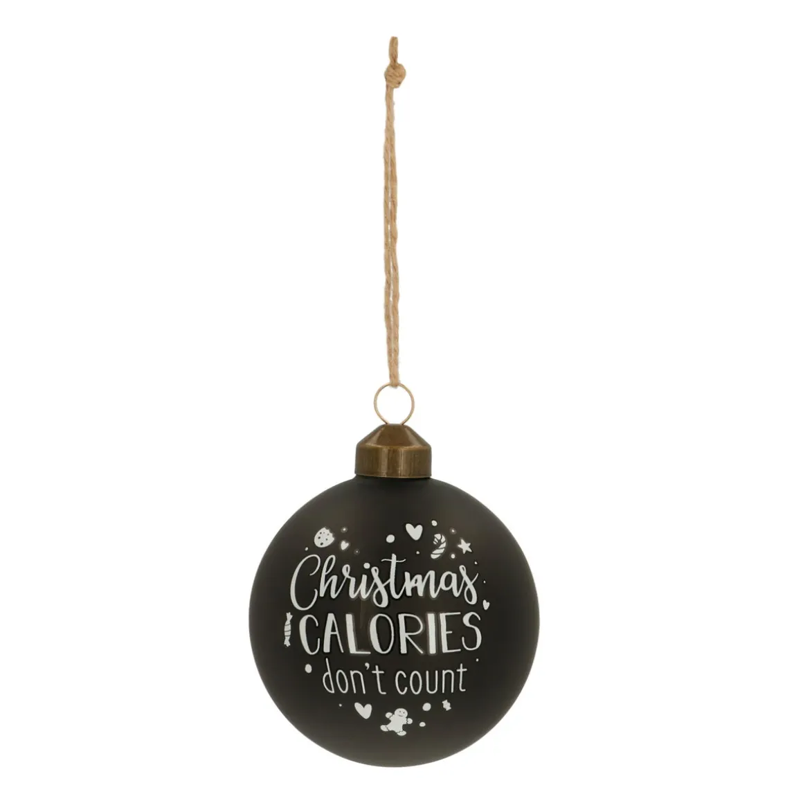 Bedruckte Weihnachtskugel mit der Aufschrift „Christmas Calories Don’t Count“. Die Kugel ist aus Glas hergestellt, 8 cm groß und in einem matten Schwarz gehalten.