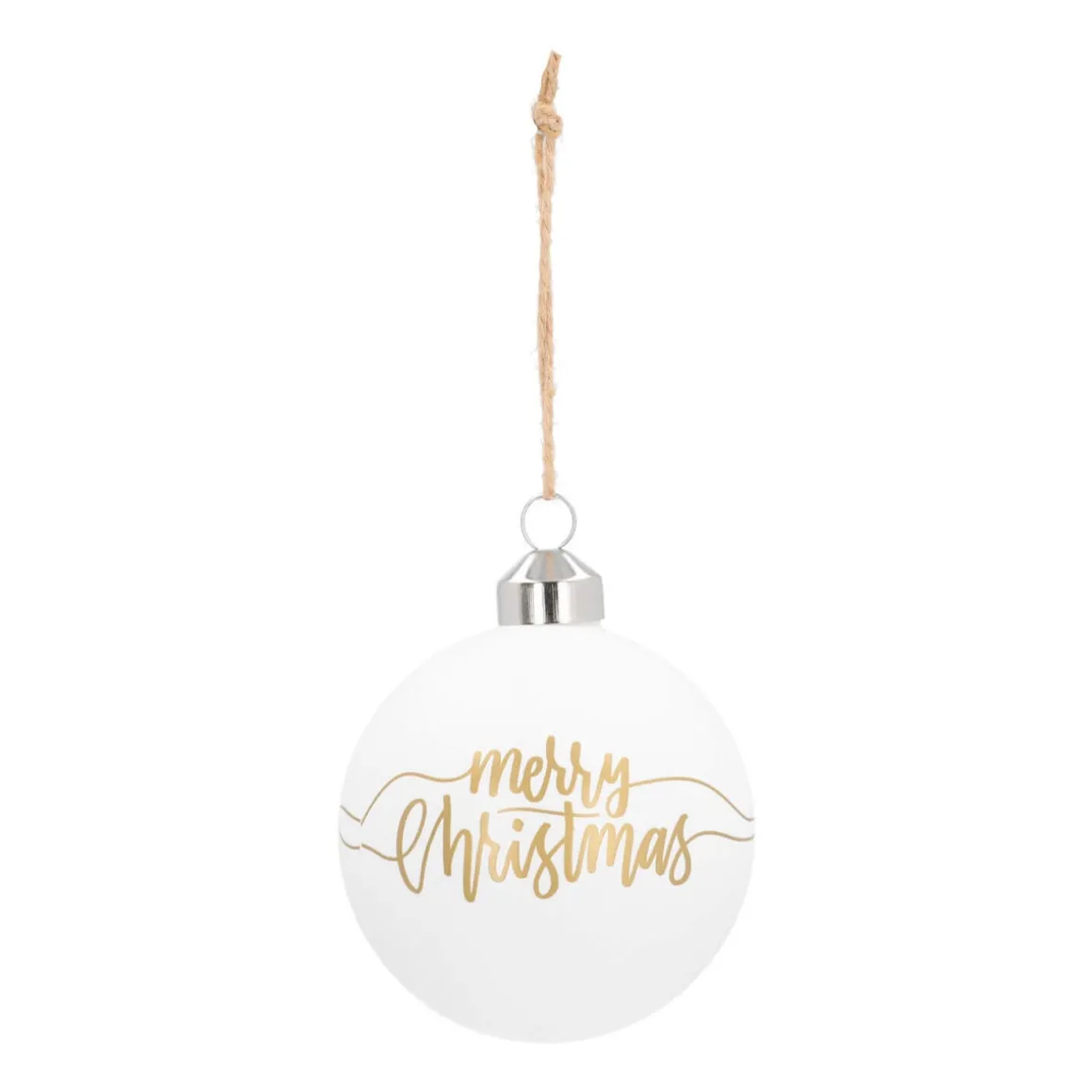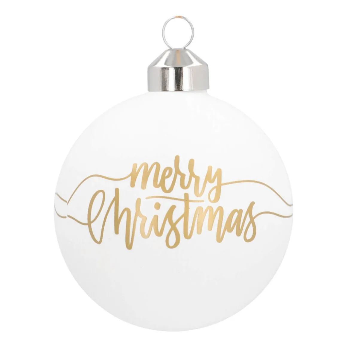 Schöne Weihnachtskugel in mattem Weiß mit Aufdruck „Merry Christmas“. Sie ist aus Glas hergestellt, hat eine Größe von 8 cm und ist von Hand dekoriert! Diese Weihnachtskugel lässt sich am Tannenbaum oder diversen Dekorationen zu vielen Farben kombinieren.