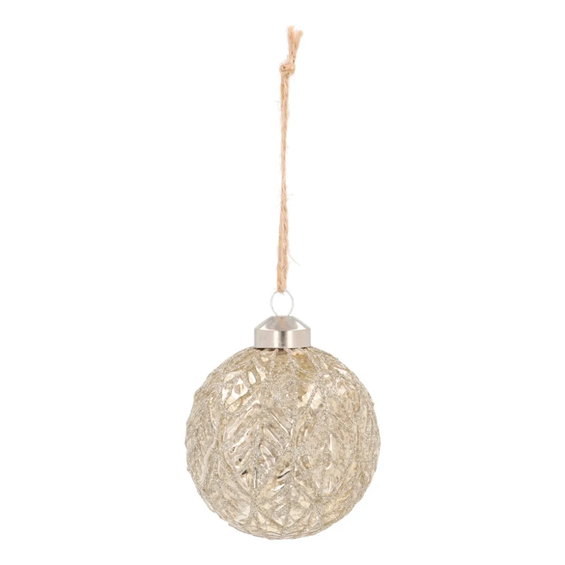 Auf der Suche nach einer schicken und festlichen Ergänzung für deinen Weihnachtsbaum? Diese luxuriöse champagnerfarbene Weihnachtskugel mit Blattader-Relief ist genau das Richtige für dich! Diese halbtransparente Weihnachtskugel ist wunderschön mit einem Blatttalmuster und handgefertigten Champagnerglitzern dekoriert. Das silberne Krönchen und das Juteband zum Aufhängen runden diese Weihnachtskugel perfekt ab. Ideal, um deinem Baum eine luxuriöse und festliche Atmosphäre zu verleihen.