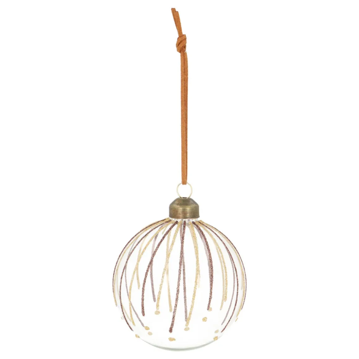 Oder, naja, ganz farblos sind sie nicht… Diese Weihnachtskugel aus Glas ist nĂ€mlich mit handgemachten Glitzerstreifen in Champagner und Gold verziert. AuĂerdem ist die stilvolle Weihnachtskugel mit verspielten goldenen Punkten versehen. Zusammen mit dem Lederband sorgt das fĂŒr einen festlichen Retro-Touch. Das luftige Glasornament mit einem Durchmesser von 8 cm vereint mĂŒhelos Stil mit Verspieltheit.