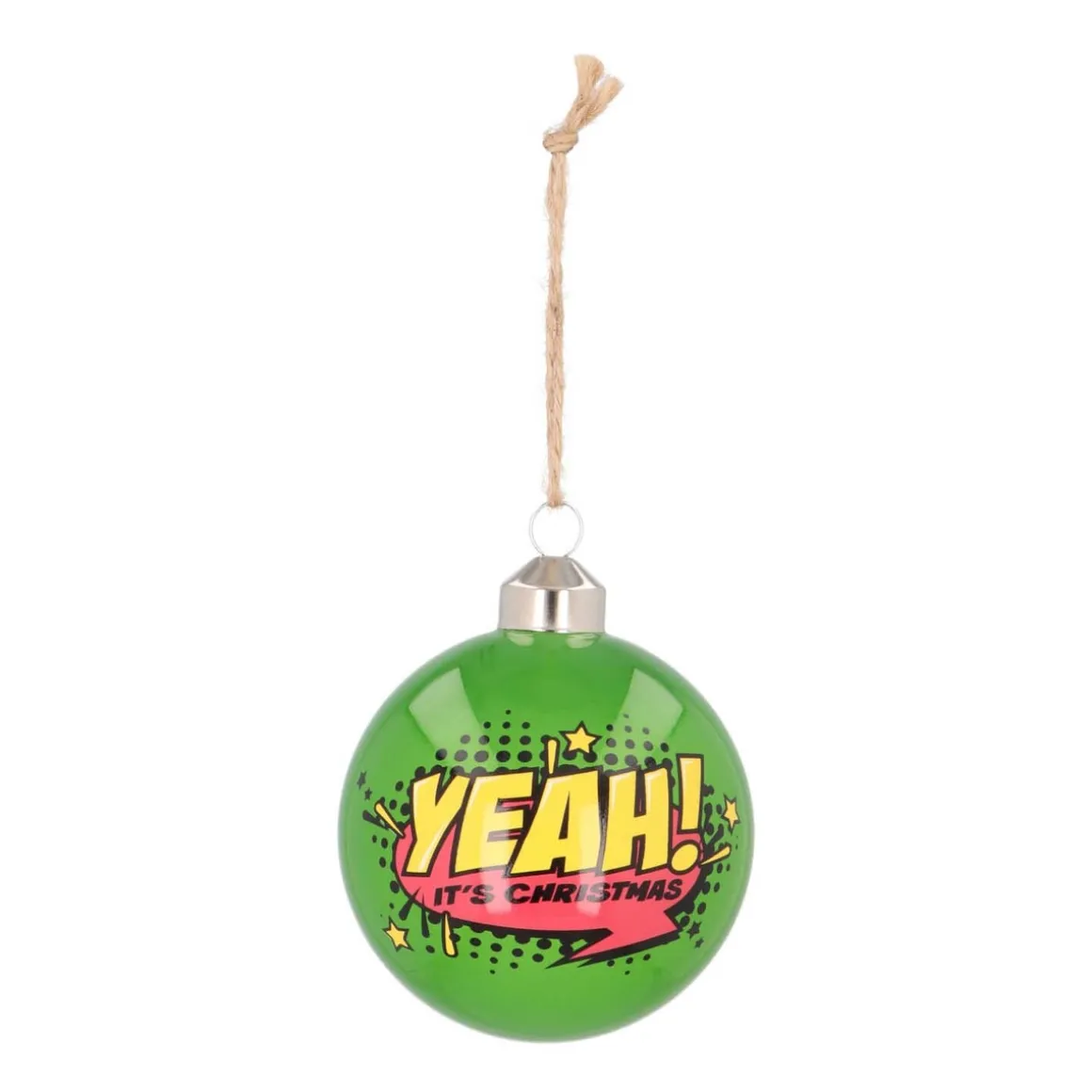 Auffallend, bunt, extravagant: Diese Pop-art Weihnachtskugel wird zum farblichen Highlight an eurem Weihnachtsbaum. In grellem Grün und mit dem Ausspruch „Silent Night… yeah right“ in großen pinken sowie schwarzen Lettern versehen, wird sie alle Blicke auf sich ziehen. Hergestellt ist die Kugel aus hochwertigem Glas und sie hat eine Größe von 8 cm.