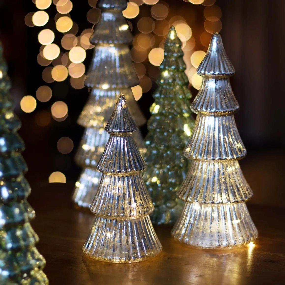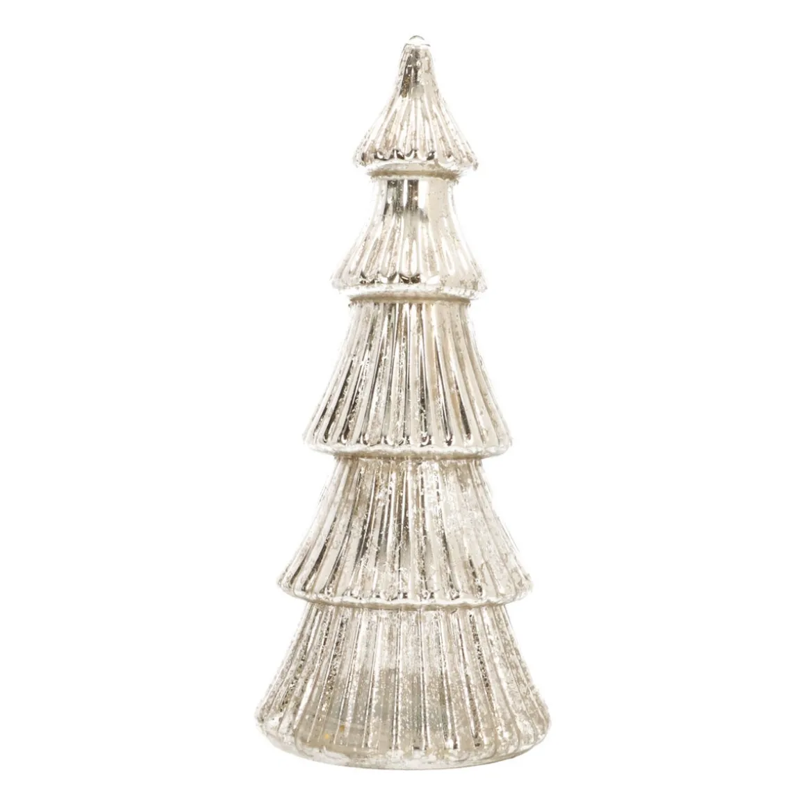 Dekorativer Tannenbaum aus Glas mit LED Beleuchtung. Linien formen sein Design, bemustert ist er mit einem Krakelee. Der Baum ist Silber gehalten, 27 cm groß und mit 10 warm-weißen LEDs versehen.