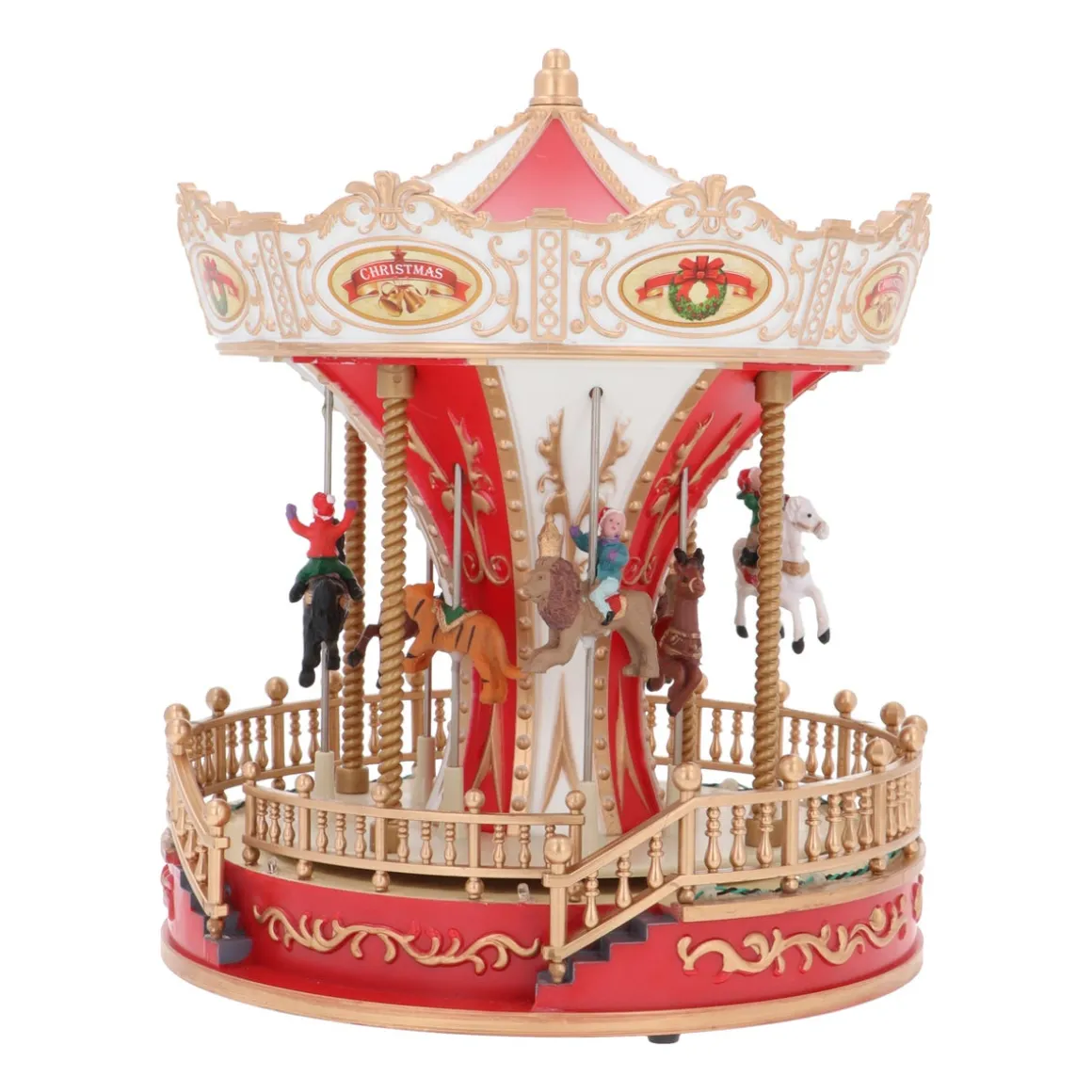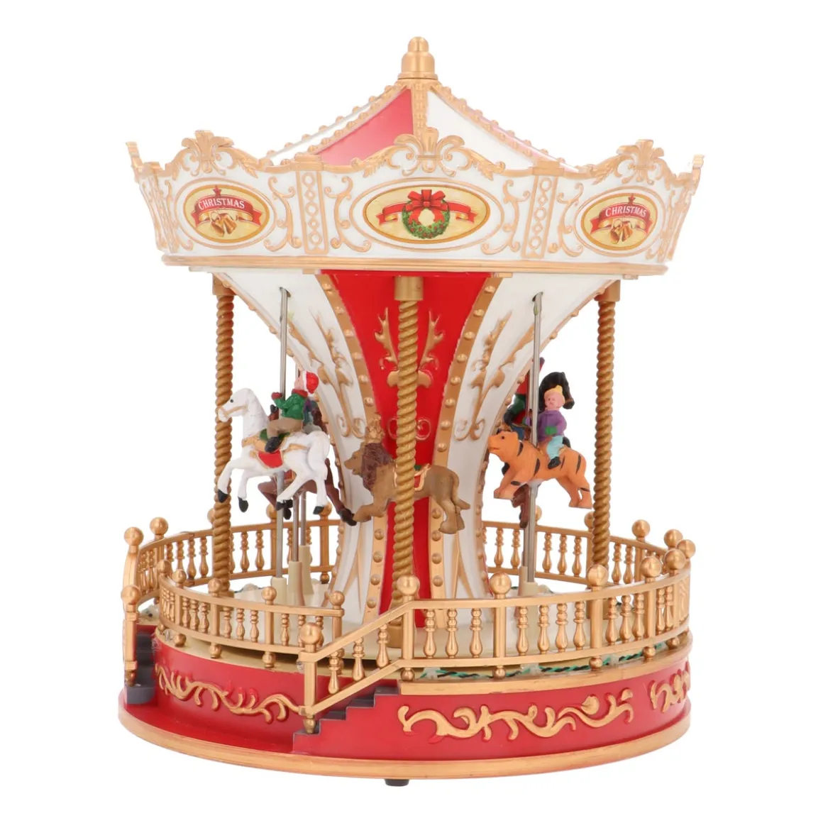 Während sich das Karussell fröhlich dreht, erklingen bekannte Weihnachtsmelodien und die bunten LED-Lichter blinken festlich dazu. Mit der klassischen Farbkombination aus Rot, Gold und Weiß ist dies der perfekte Stimmungsmacher für die Feiertage.