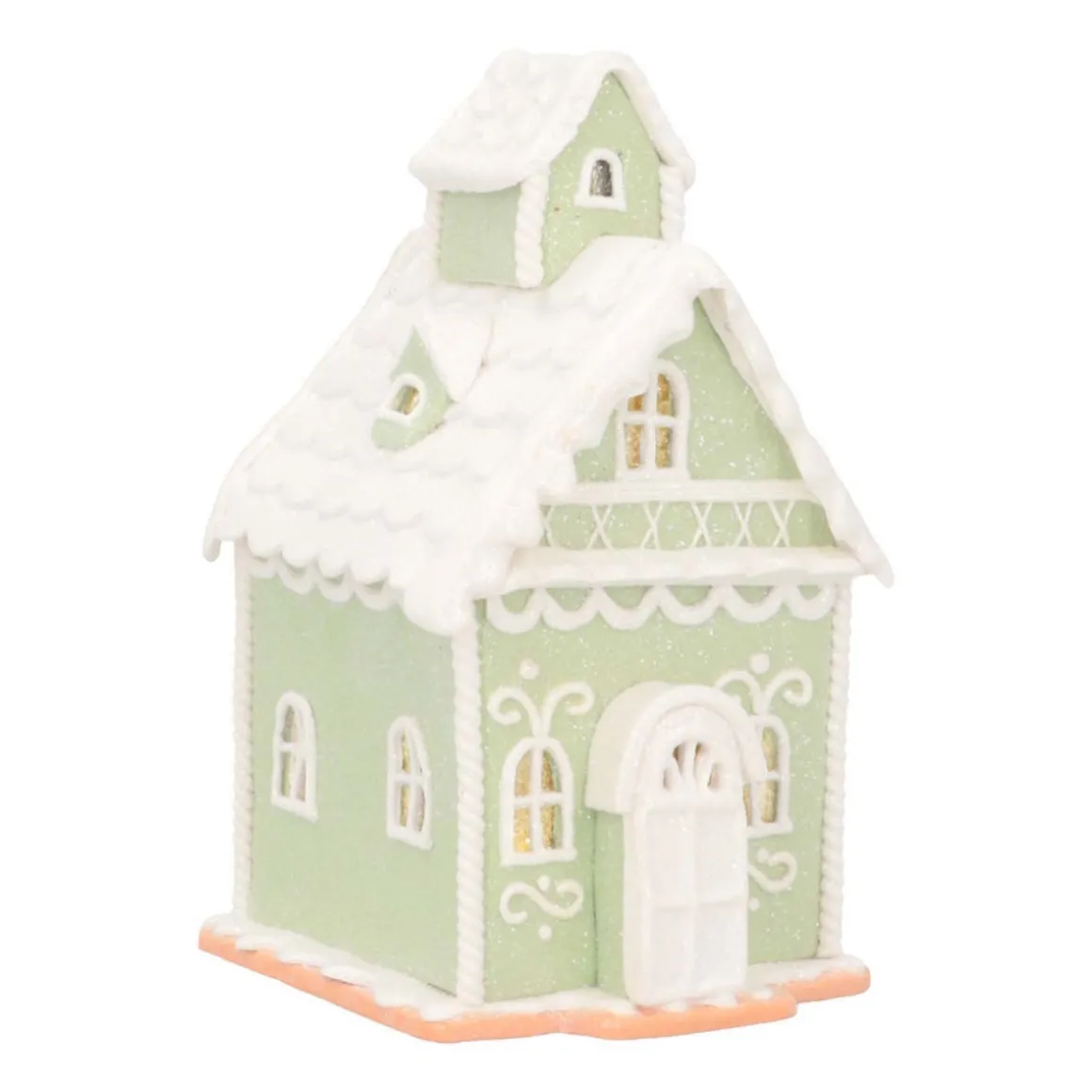 Dieses zauberhafte Lebkuchenhaus aus Modelliermasse erstrahlt in einer romantischen hellgrünen Farbe. Mit seinem typischen Lebkuchenhaus-Charme wird es im Handumdrehen eure Weihnachtsdekoration erobern und eine festliche Weihnachtsstimmung verbreiten. Mit einer Größe von 19 cm findet es einen idealen Platz auf eurer Fensterbank.
