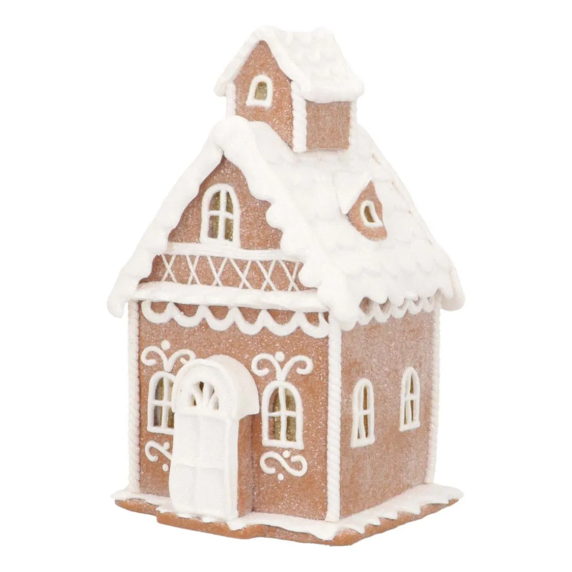Betritt eine bezaubernde Welt mit unserem LED-Lebkuchenhaus in Form einer Kirche. Im typischen Braun und Weiß gehalten, bringt dieses kunstvoll gestaltete Meisterwerk den traditionellen Charme eines Lebkuchenhauses mit. Mit einer Höhe von 19 cm ist diese Kirche ein echter Blickfang, der auf Fensterbänken oder Tischen das festliche Ambiente in eurem Zuhause verstärkt. Hergestellt ist das Haus aus hochwertiger Modelliermasse.